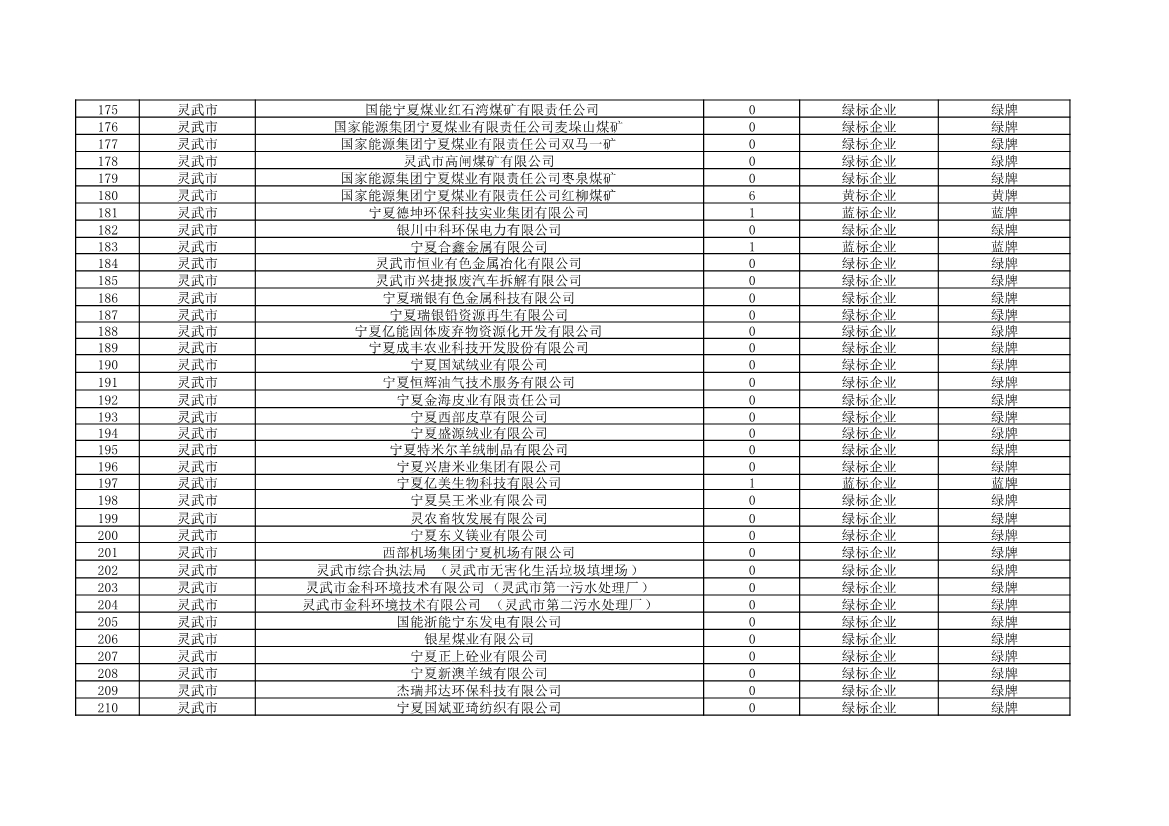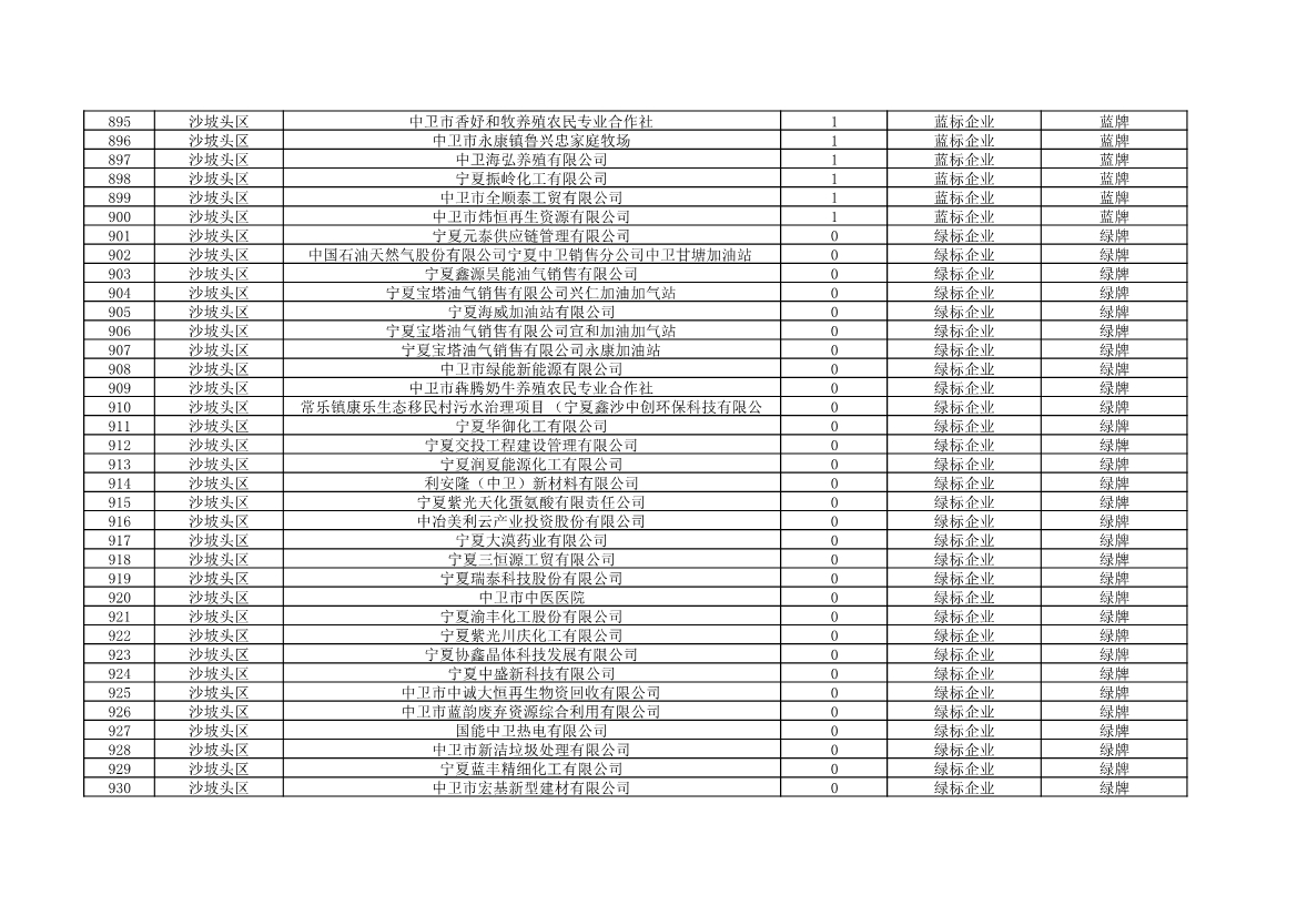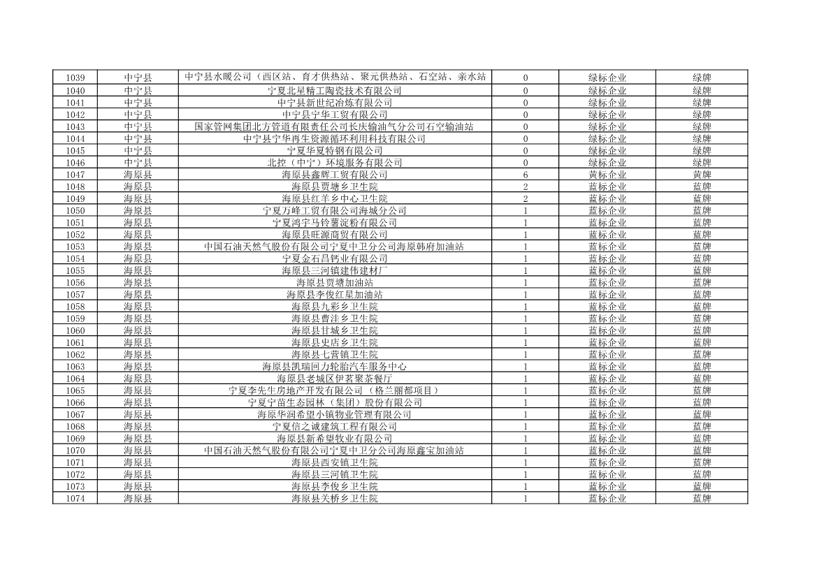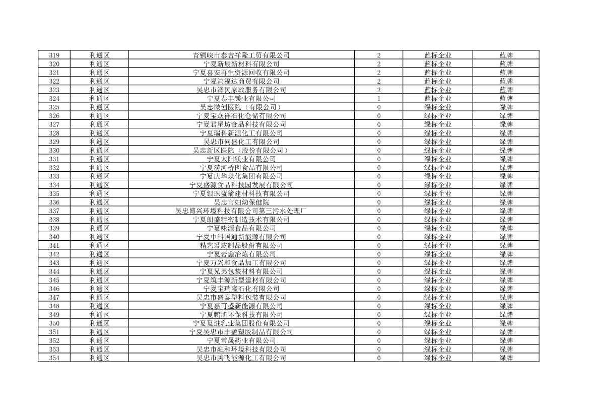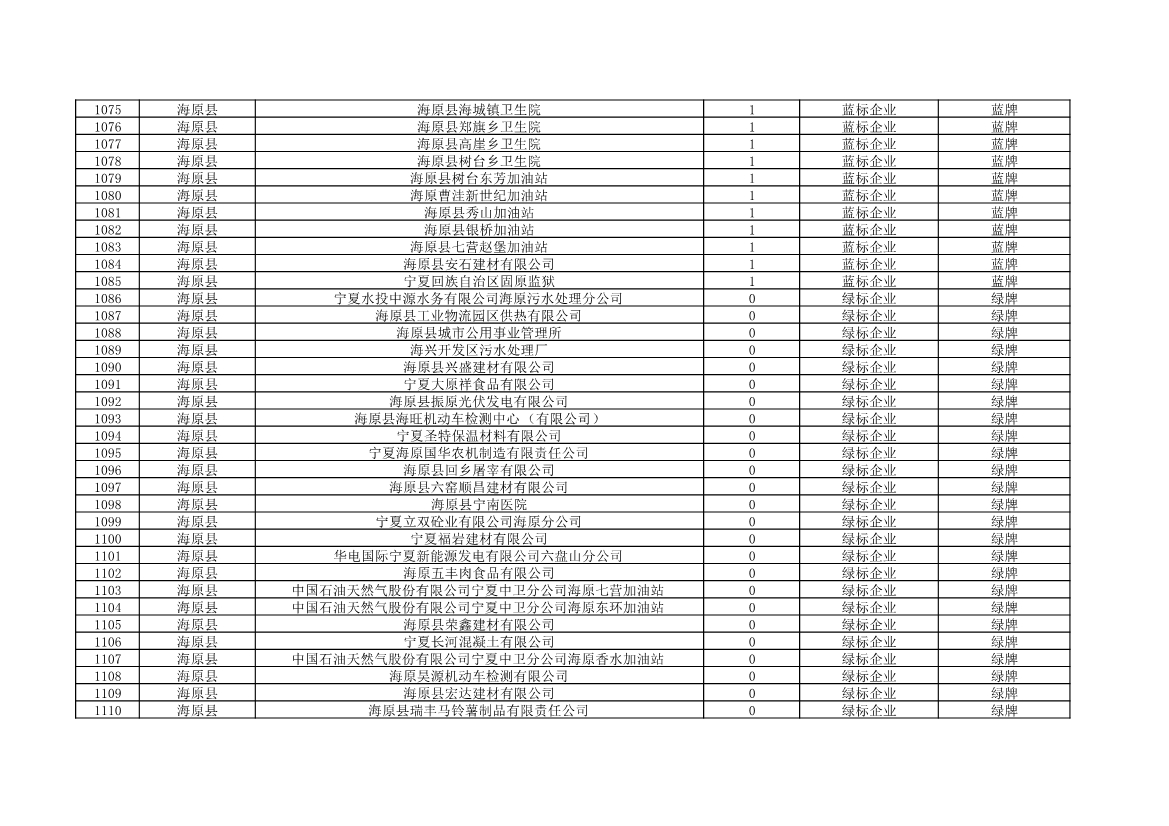 根據(jù)《中華人民共和國環(huán)境保護法》《企業(yè)信息公示暫行條例》等法律、行政法規(guī)和《企業(yè)環(huán)境信用評價辦法(試行)》(環(huán)發(fā)〔2013〕150號)、《寧夏回族自治區(qū)企業(yè)環(huán)境信用評價辦法》(寧環(huán)規(guī)發(fā)〔2019〕5號)規(guī)定,自治區(qū)生態(tài)環(huán)境廳組織全區(qū)各地級市生態(tài)環(huán)境部門開展了2021年全區(qū)企業(yè)環(huán)境信用評價工作。全區(qū)參評企業(yè)1250家,其中綠牌969家、藍牌226家、黃牌52家、紅牌3家。現(xiàn)將評價結(jié)果予以公布。