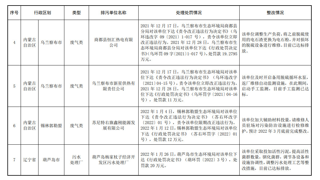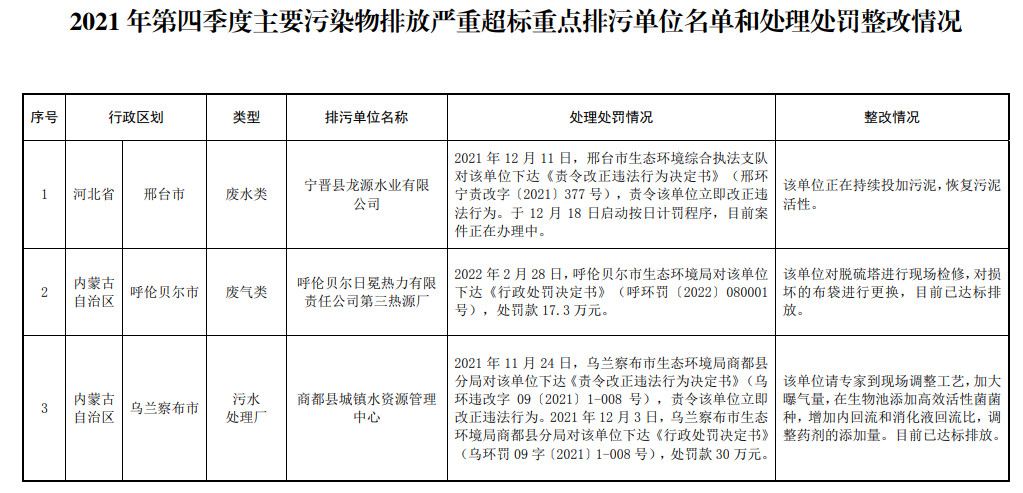 《2021年第四季度主要污染物排放嚴重超標重點排污單位名單和處理處罰整改情況》