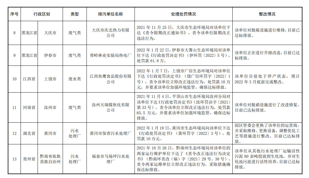 2021年第四季度主要污染物排放嚴重超標重點排污單位名單和處理處罰整改情況