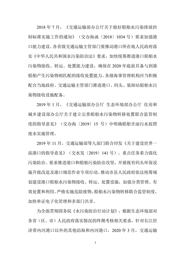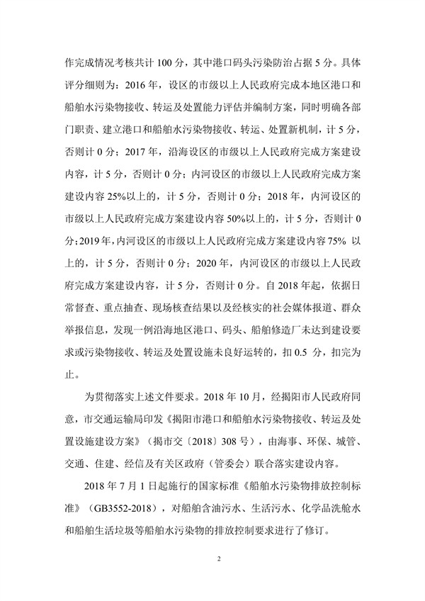 揭陽市交通運輸局印發(fā)《揭陽市交通運輸局關于印發(fā)揭陽市船舶水污染物接收、轉(zhuǎn)運及處置設施建設方案的通知》,依據(jù)《港口和船舶水污染物接收轉(zhuǎn)運及處置設施建設方案編制指南》的要求,船舶水污染物主要包括含油污水、化學品洗艙水、生活污水、生活垃圾。根據(jù)《揭陽港總體規(guī)劃》及實地調(diào)研,揭陽港靠港船舶產(chǎn)生污染物主要是含油污水、化學品洗艙水、生活污水和生活垃圾。文件全文如下
