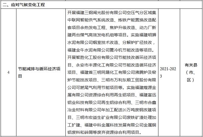 循環(huán)經(jīng)濟(jì)項(xiàng)目:實(shí)施福建煌源金屬有限公司資源綜合利用再生鋁項(xiàng)目、福建富遠(yuǎn)鋁業(yè)科技有限公司再生鋁綜合利用、三明市合鑫冶金材料有限公司年加工配送20萬噸廢鋼改建項(xiàng)目、三明市宏益生礦業(yè)有限公司廢鐵礦渣處理加工擴(kuò)建、福建中科金屬科技發(fā)展有限公司金屬銅鋁廢料和碎屑等廢棄資源綜合利用項(xiàng)目。