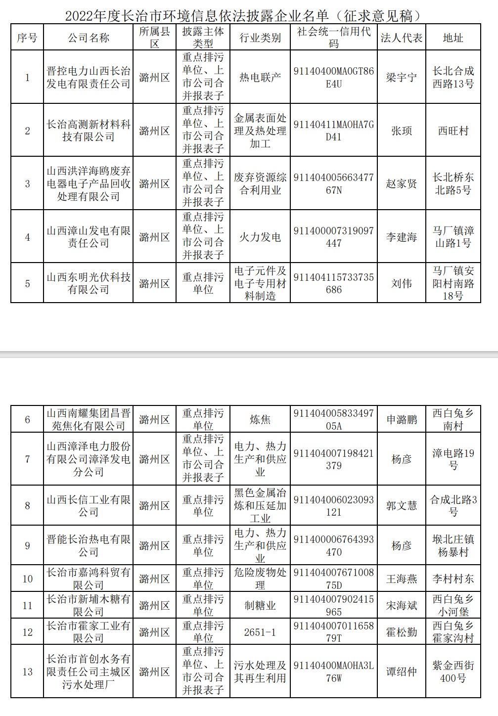 《長(zhǎng)治市2022年度環(huán)境信息依法披露企業(yè)名單征求意見(jiàn)》