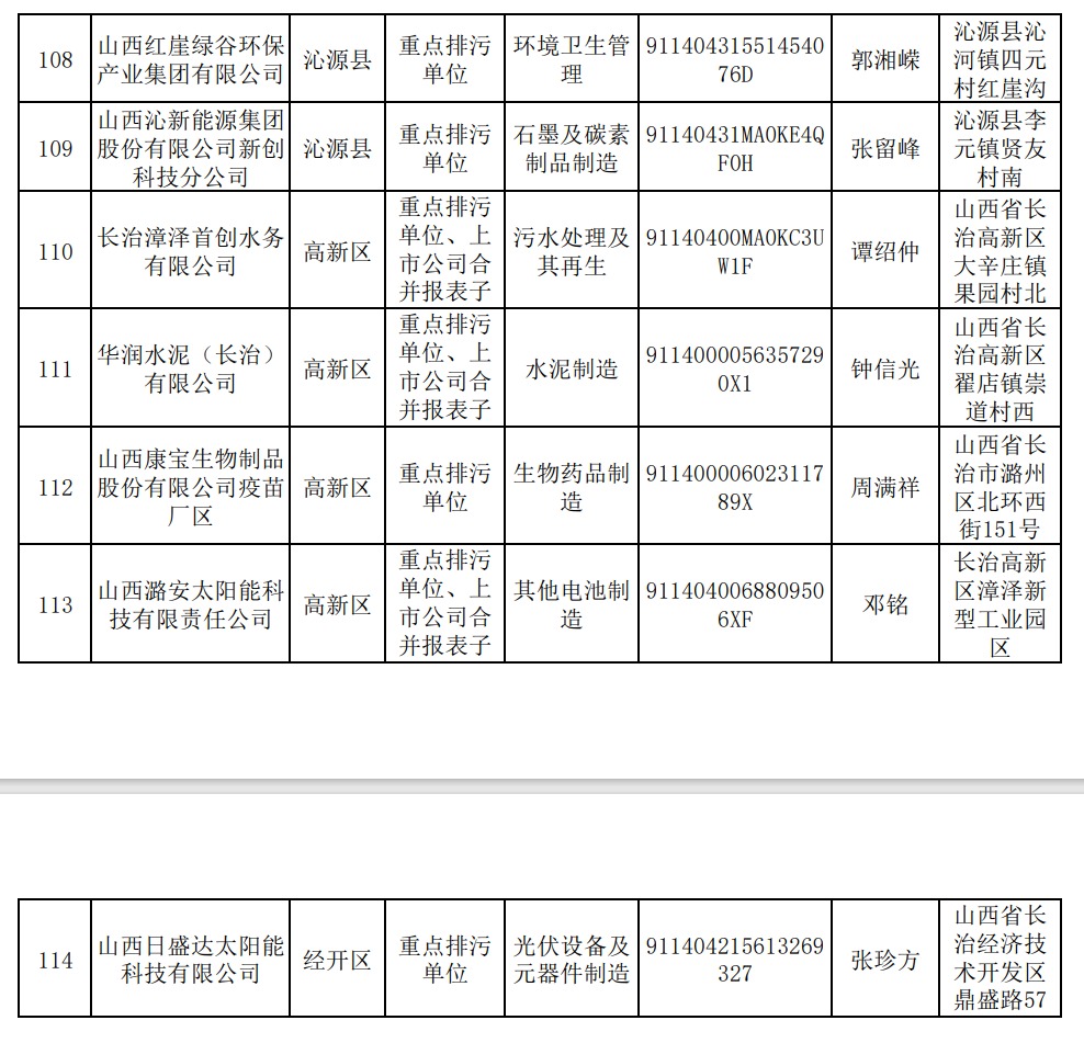 日前,山西省長(zhǎng)治市生態(tài)環(huán)境局就2022年度長(zhǎng)治市環(huán)境信息依法披露企業(yè)名單(征求意見(jiàn)稿)進(jìn)行公示公告,共有114家企業(yè)上榜,詳情如下: