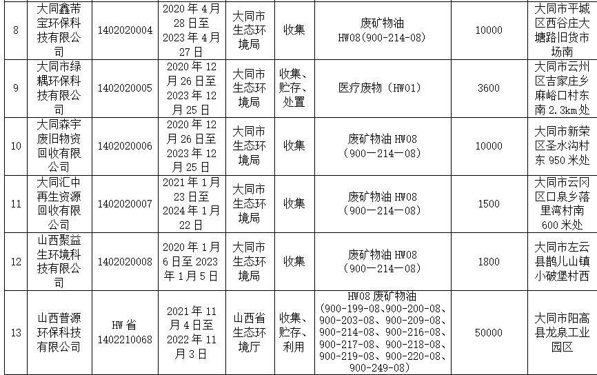 《山西省大同市危險廢物經(jīng)營單位一覽表》
