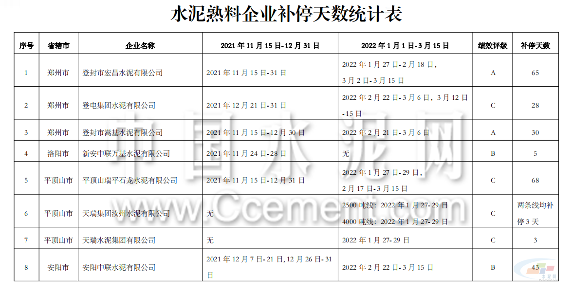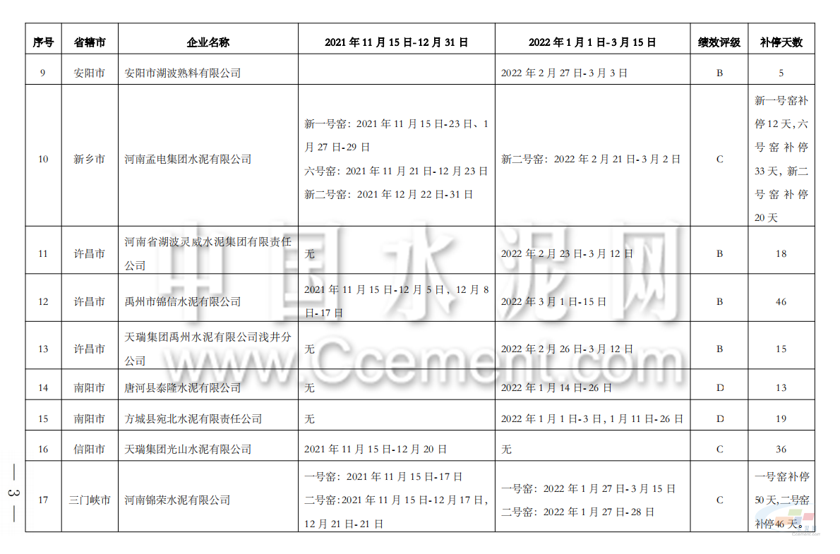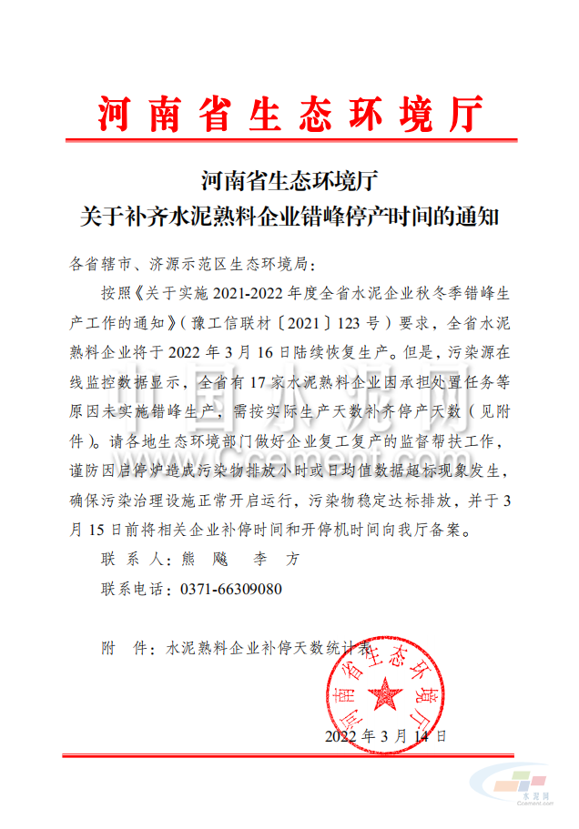 《河南省 關(guān)于補(bǔ)齊水泥熟料企業(yè)錯峰停產(chǎn)時間的通知》
