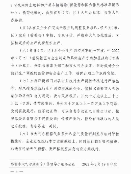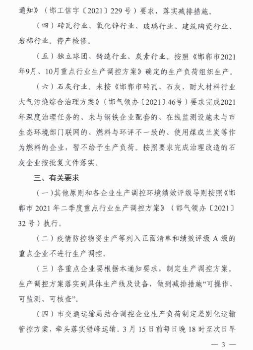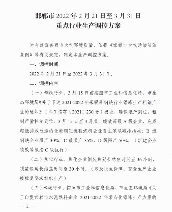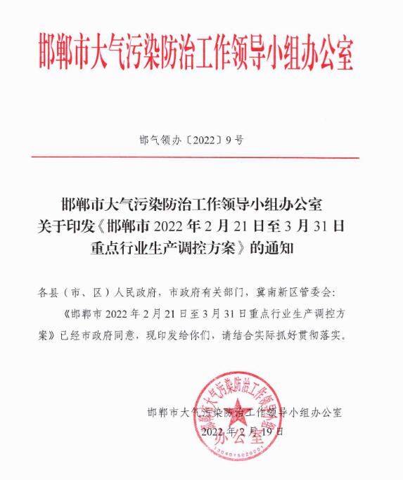 《邯鄲市2022年2月21日至3月31日重點(diǎn)行業(yè)生產(chǎn)調(diào)控方案》(邯?dú)忸I(lǐng)辦【2022】9號(hào))