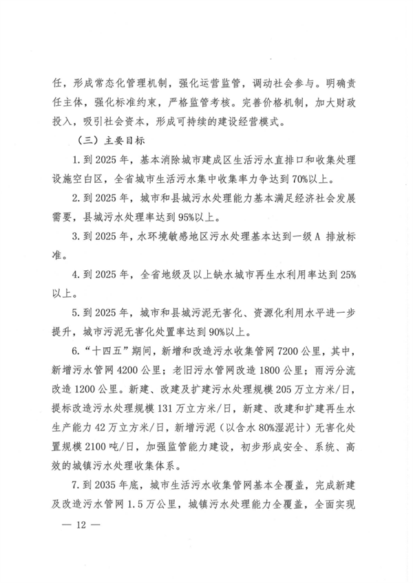 云南省住房和城鄉(xiāng)建設廳 云南省發(fā)展和改革委員會印發(fā)《云南省城鎮(zhèn)污水處理及再生利用設施建設“十四五”規(guī)劃》,“十四五”期間,云南省將完成縣城污水處理率95%以上,城市污水集中收集率70%以上,城市污泥無害化處理率90%以上,地級及以上缺水城市再生水利用率25%以上等目標。全省城鎮(zhèn)新建、改建、擴建污水處理規(guī)模207.87萬立方米/日,完成提標改造131.9萬立方米/日,新增污泥無害化處置規(guī)模2120噸/日,完成城鎮(zhèn)污水處理及再生利用設施投資326.74億元。文件全文如下:
