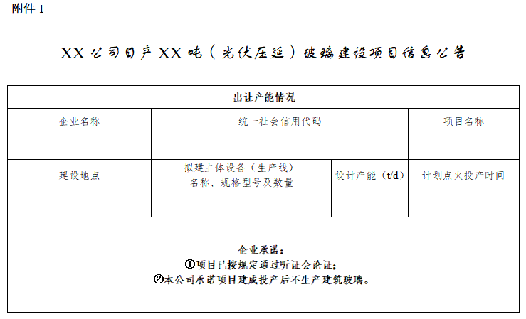(四)新建光伏壓延玻璃項(xiàng)目可不制定產(chǎn)能置換方案,但要建立產(chǎn)能風(fēng)險(xiǎn)預(yù)警機(jī)制。確有必要新建的,由市州人民政府正式行文報(bào)省工業(yè)和信息化廳、省發(fā)展和改革委,由省工業(yè)和信息化廳、省發(fā)展和改革委委托全國性的行業(yè)組織或中介機(jī)構(gòu)召開聽證會(huì),論證項(xiàng)目建設(shè)的必要性、技術(shù)先進(jìn)性、能耗水平、環(huán)保水平等,省工業(yè)和信息化廳會(huì)同省發(fā)展和改革委根據(jù)聽證意見等情況,研究確定是否對項(xiàng)目予以公示公告(附件1)。項(xiàng)目建成投產(chǎn)后企業(yè)履行承諾不生產(chǎn)建筑玻璃。