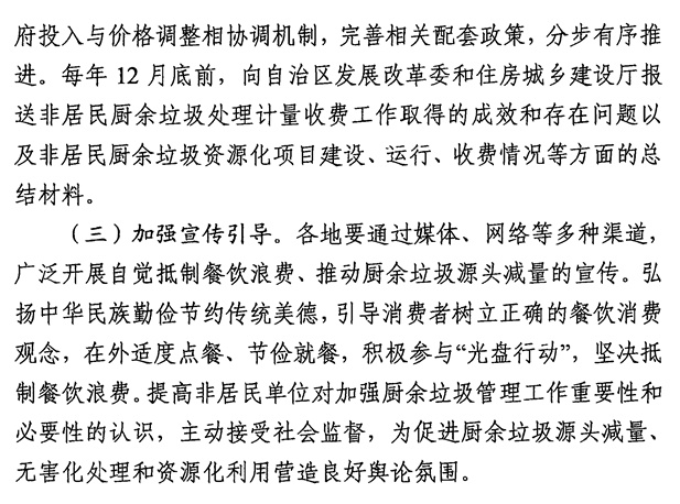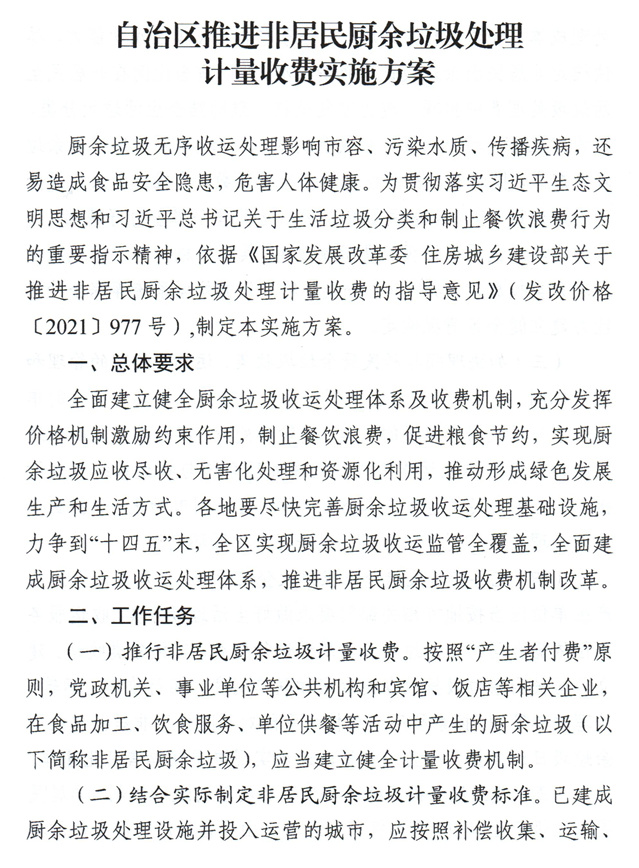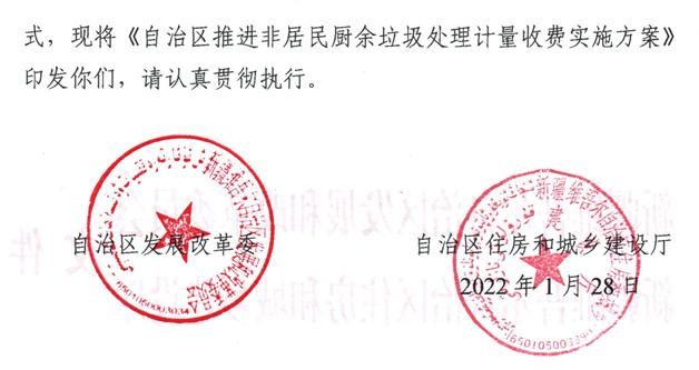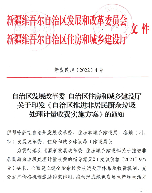 《新疆自治區(qū)推進(jìn)非居民廚余垃圾處理計(jì)量收費(fèi)實(shí)施方案》(新發(fā)改歸【2022】4號(hào))