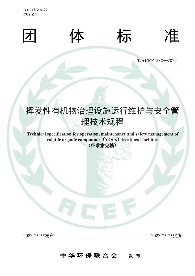 根據(jù)《團體標(biāo)準(zhǔn)管理規(guī)定》《中華環(huán)保聯(lián)合會團體標(biāo)準(zhǔn)管理辦法(試行)》相關(guān)要求,由上海大學(xué)牽頭中國礦業(yè)大學(xué)(北京)、同濟大學(xué)、中國環(huán)境科學(xué)研究院、上海市環(huán)境科學(xué)研究院、山東建筑大學(xué)和中華環(huán)保聯(lián)合會VOCs污染防治專業(yè)委員會等企事業(yè)單位共同編制的《揮發(fā)性有機物治理設(shè)施運行維護與安全管理技術(shù)規(guī)程》團體標(biāo)準(zhǔn),經(jīng)編制組調(diào)研、起草、研討和修改完善后,已完成征求意見稿;為保證標(biāo)準(zhǔn)的科學(xué)性、實用性及可操作性,現(xiàn)公開征求意見。