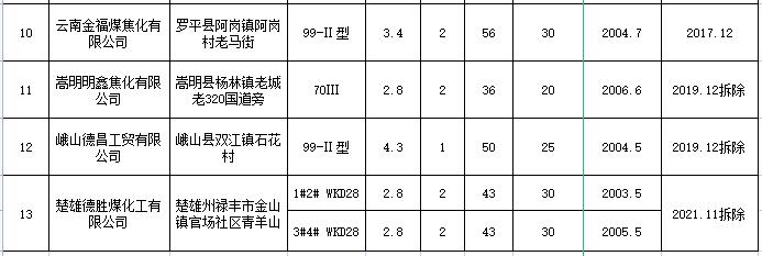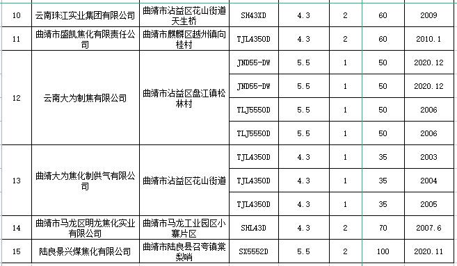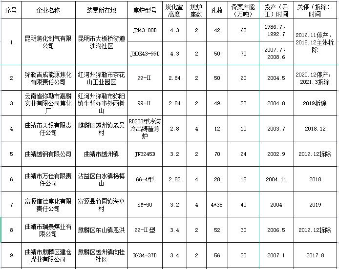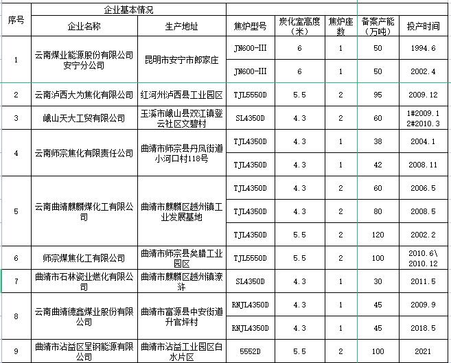 為規(guī)范焦化行業(yè)有序發(fā)展,云南省公示已建成且在產炭化室高度4.3米及以上焦化裝置、2016年及以后關閉焦化裝置清單。詳情如下: