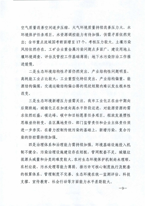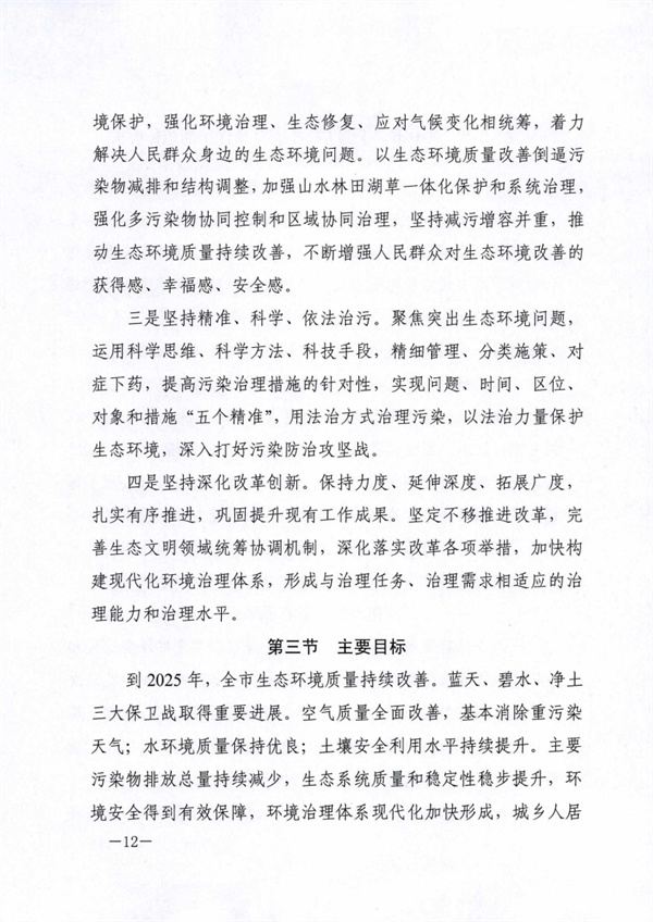 目標(biāo)到2025年,全市生態(tài)環(huán)境質(zhì)量持續(xù)改善。藍(lán)天、碧水、凈土三大保衛(wèi)戰(zhàn)取得重要進(jìn)展??諝赓|(zhì)量全面改善,基本消除重污染天氣;水環(huán)境質(zhì)量保持優(yōu)良;土壤安全利用水平持續(xù)提升。主要污染物排放總量持續(xù)減少,生態(tài)系統(tǒng)質(zhì)量和穩(wěn)定性穩(wěn)步提升,環(huán)境安全得到有效保障,環(huán)境治理體系現(xiàn)代化加快形成,城鄉(xiāng)人居環(huán)境明顯改善,生產(chǎn)生活方式綠色轉(zhuǎn)型成效顯著,國(guó)土空間開發(fā)保護(hù)格局得到優(yōu)化,綠色低碳發(fā)展加快推進(jìn),能源資源配置更加合理、利用效率大幅提高,碳排放強(qiáng)度持續(xù)降低,簡(jiǎn)約適度、綠色低碳的生活方式加快形成,生態(tài)文明建設(shè)實(shí)現(xiàn)新進(jìn)步,美麗中國(guó)建設(shè)目標(biāo)取得明顯進(jìn)展。詳情如下: