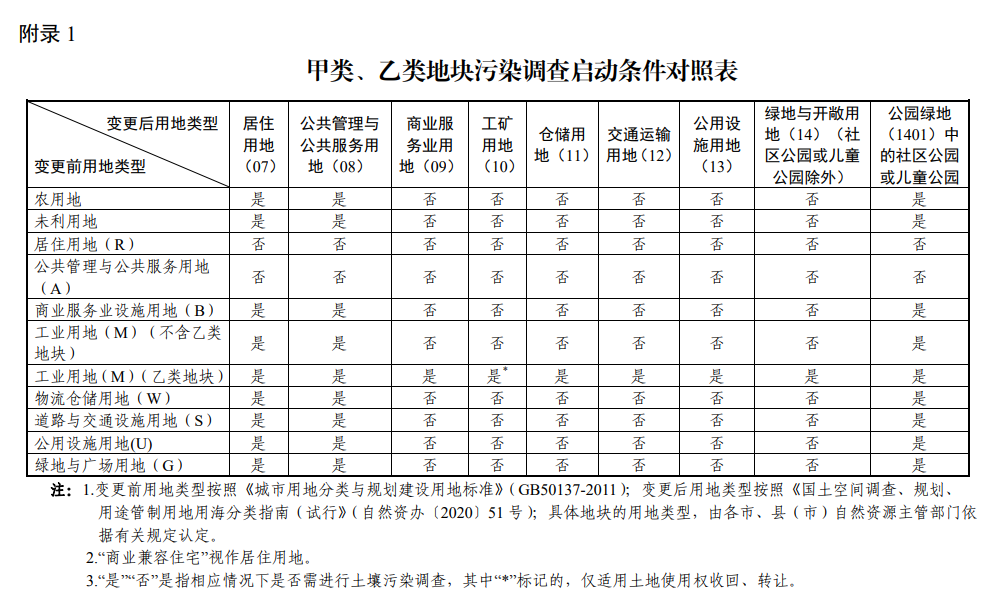 附錄:1.甲類、乙類地塊污染調(diào)查啟動(dòng)條件對照表 2.建設(shè)用地土壤污染風(fēng)險(xiǎn)管控和修復(fù)流程圖