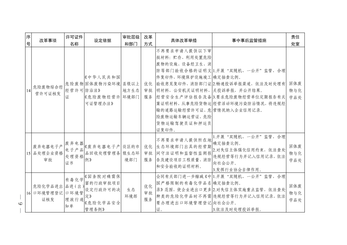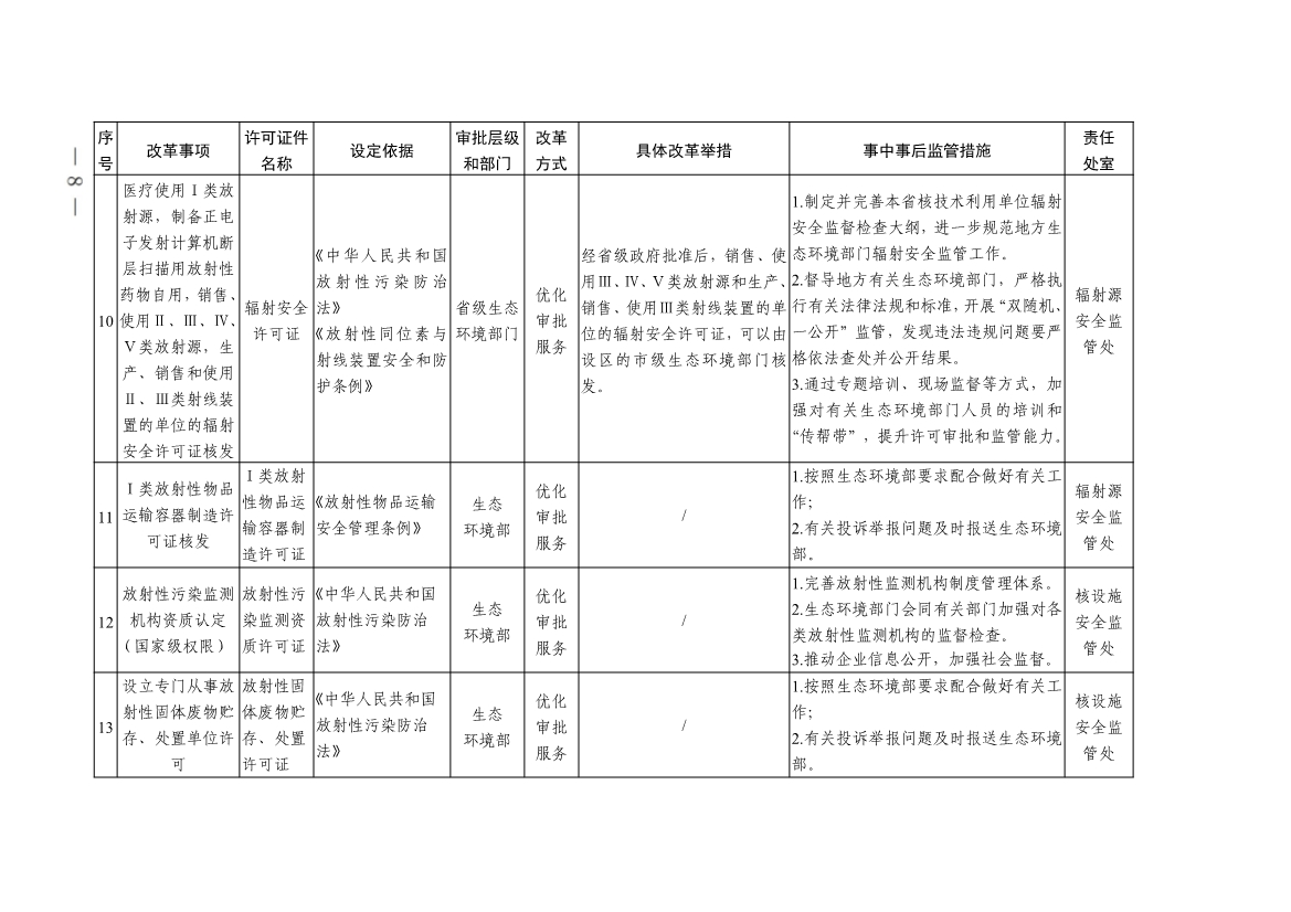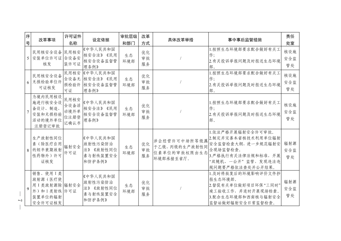(一)直接取消審批。在全省范圍內(nèi)對(duì)“放射性污染監(jiān)測(cè)機(jī)構(gòu)資質(zhì)認(rèn)定(省級(jí)權(quán)限)”直接取消審批。取消審批后,取得相應(yīng)計(jì)量認(rèn)證資質(zhì)的檢驗(yàn)檢測(cè)機(jī)構(gòu)即可從事核技術(shù)利用建設(shè)項(xiàng)目輻射監(jiān)測(cè)工作,無(wú)需重復(fù)取得生態(tài)環(huán)境廳的批準(zhǔn),行政機(jī)關(guān)、企事業(yè)單位、行業(yè)組織亦不得要求企業(yè)提供相關(guān)認(rèn)定和批準(zhǔn)文件。(二)優(yōu)化審批服務(wù)。將“生產(chǎn)放射性同位素(除醫(yī)療自用的短半衰期放射性藥物外)許可證核發(fā)”涉企經(jīng)營(yíng)許可中場(chǎng)所等級(jí)屬于乙級(jí)、丙級(jí)的生產(chǎn)放射性同位素單位的審批權(quán)限由生態(tài)環(huán)境部承接至省廳?!搬t(yī)療使用I類(lèi)放射源,制備正電子發(fā)射計(jì)算機(jī)斷層掃描用放射性藥物自用,銷(xiāo)售、使用II、III、IV、V類(lèi)放射源,生產(chǎn)、銷(xiāo)售和使用II、III類(lèi)射線裝置的單位的輻射安全許可證核發(fā)”涉企經(jīng)營(yíng)許可中銷(xiāo)售、使用III、IV、V類(lèi)放射源和生產(chǎn)、銷(xiāo)售、使用III類(lèi)射線裝置的單位的輻射安全許可證,經(jīng)省級(jí)政府批準(zhǔn)后,下放至設(shè)區(qū)的市級(jí)生態(tài)環(huán)境部門(mén)核發(fā)。對(duì)“排污許可”“危險(xiǎn)廢物綜合經(jīng)營(yíng)許可證核發(fā)”“廢棄電器電子產(chǎn)品處理企業(yè)資格審批”涉企經(jīng)營(yíng)事項(xiàng),精簡(jiǎn)申請(qǐng)材料,加強(qiáng)信息共享,提高審批效率。
