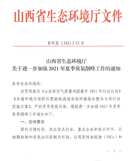 《山西省 關(guān)于進(jìn)一步加強(qiáng)2021年夏季臭氧削峰工作的通知》(晉環(huán)發(fā)【2021】25號(hào))