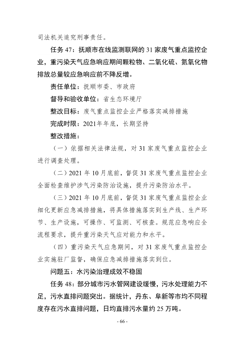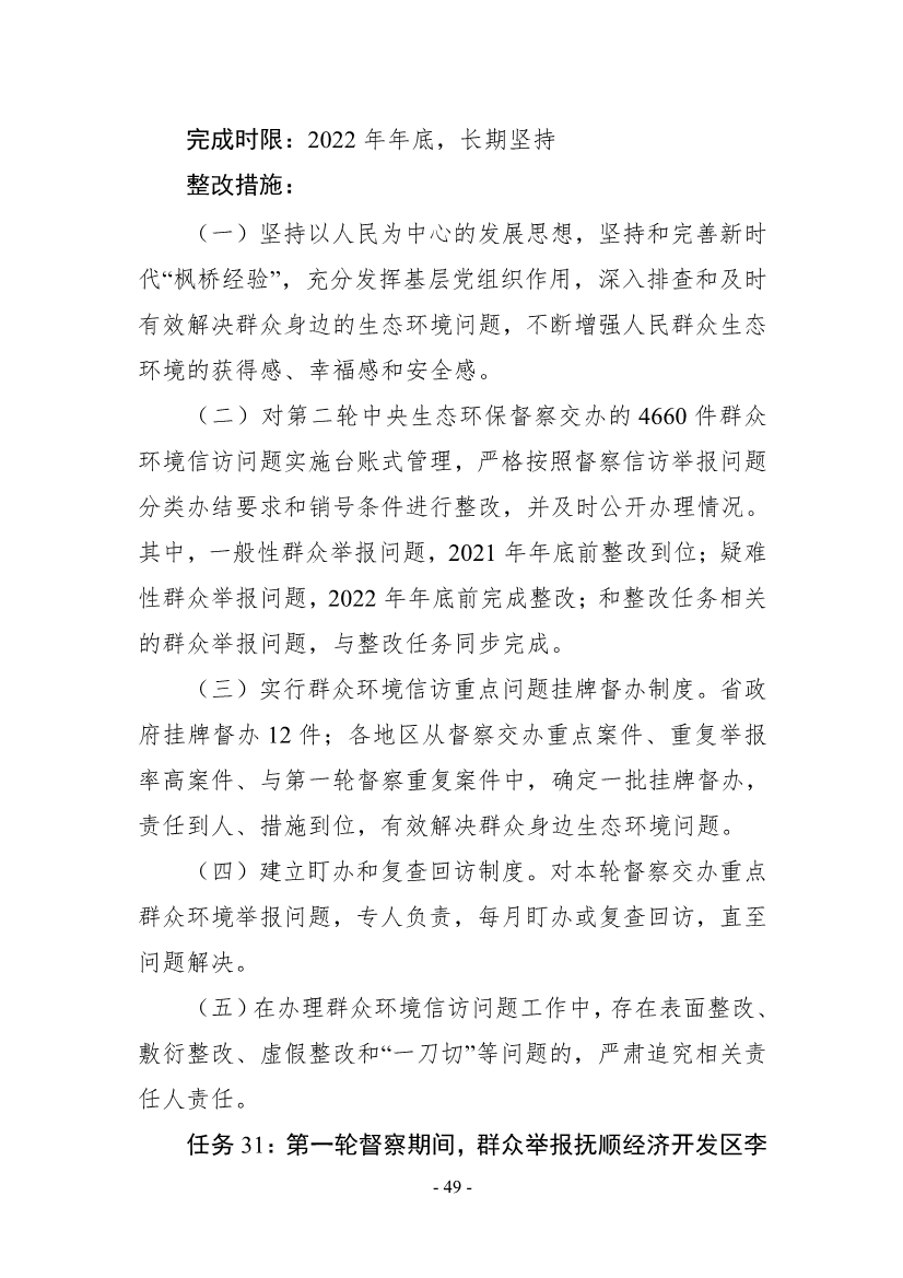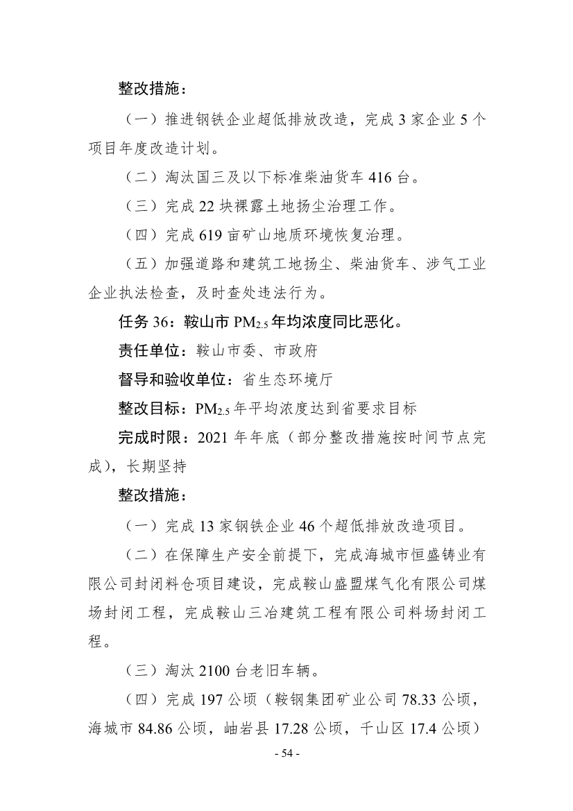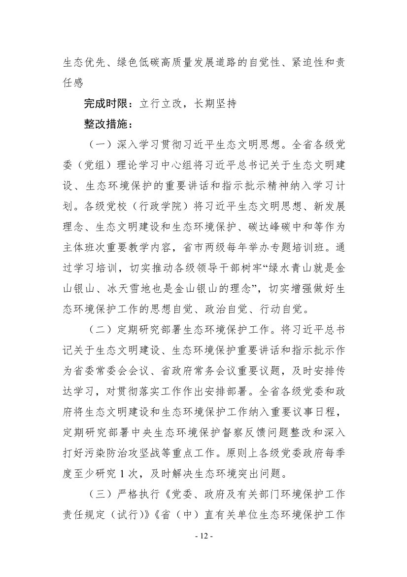 《整改方案》明確,按照“全面整改、閉環(huán)管理,分級(jí)負(fù)責(zé)、分類實(shí)施,綜合施策、標(biāo)本兼治,‘當(dāng)下改’、‘長(zhǎng)久立’相結(jié)合”的原則,全面開(kāi)展督察整改工作,實(shí)現(xiàn)“習(xí)近平生態(tài)文明思想更加深入人心、督察反饋問(wèn)題全部整改到位、生態(tài)環(huán)境質(zhì)量持續(xù)改善、現(xiàn)代環(huán)境治理體系建設(shè)取得新成效”的目標(biāo)。2021年年底前,督察組移交的責(zé)任追究問(wèn)題依規(guī)依紀(jì)依法追究到位;2022年年底前,督察組交辦的4660件群眾環(huán)境信訪舉報(bào)案件完成整改;到2025年,主要污染物排放總量持續(xù)減少,空氣環(huán)境質(zhì)量穩(wěn)步提升,重污染天氣基本消除;地表水和近岸海域優(yōu)良水質(zhì)比例達(dá)到國(guó)家要求,國(guó)控劣V類斷面基本消除;受污染耕地安全利用率和污染地塊安全利用率穩(wěn)步提升。