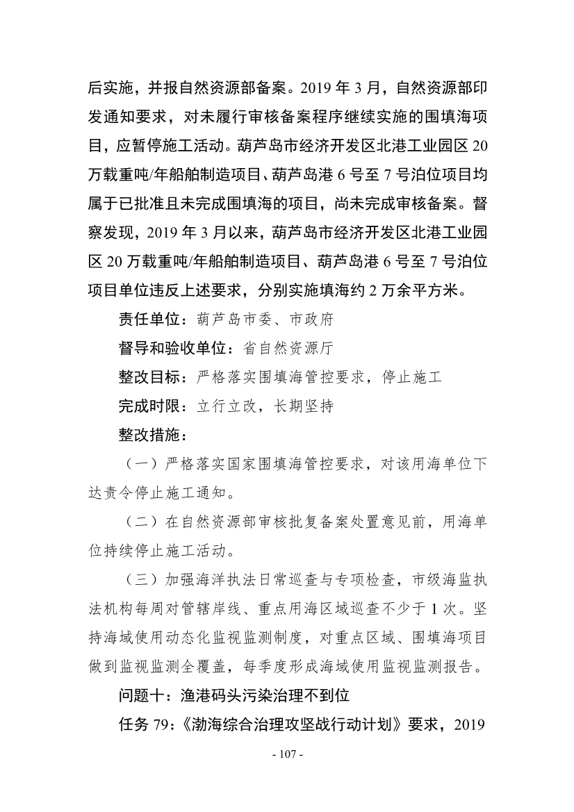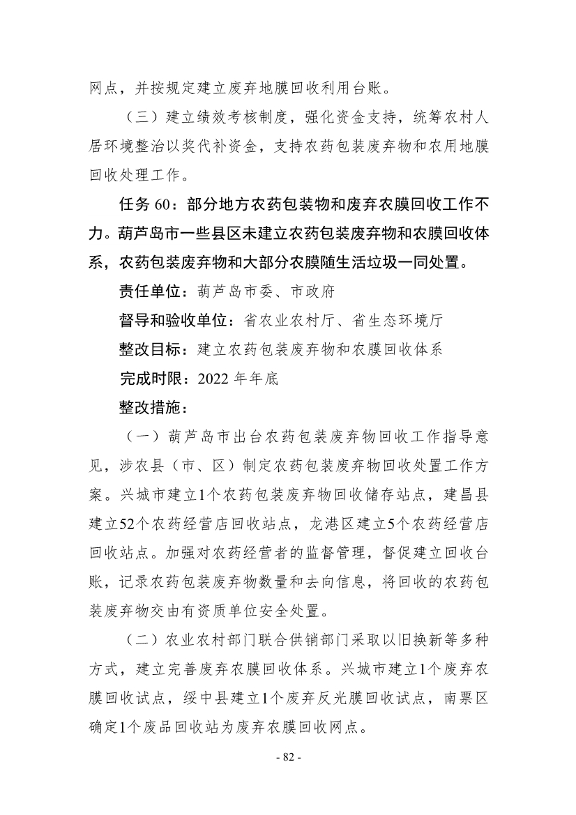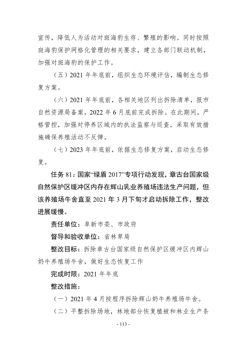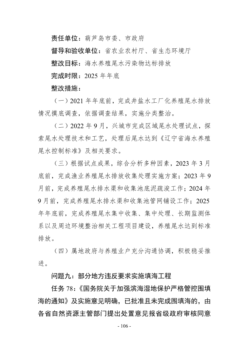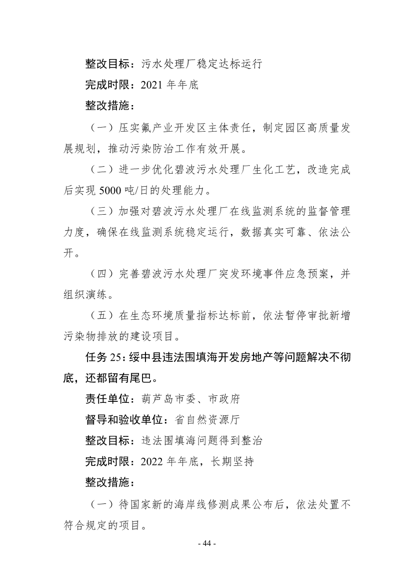 《整改方案》明確,按照“全面整改、閉環(huán)管理,分級(jí)負(fù)責(zé)、分類實(shí)施,綜合施策、標(biāo)本兼治,‘當(dāng)下改’、‘長(zhǎng)久立’相結(jié)合”的原則,全面開(kāi)展督察整改工作,實(shí)現(xiàn)“習(xí)近平生態(tài)文明思想更加深入人心、督察反饋問(wèn)題全部整改到位、生態(tài)環(huán)境質(zhì)量持續(xù)改善、現(xiàn)代環(huán)境治理體系建設(shè)取得新成效”的目標(biāo)。2021年年底前,督察組移交的責(zé)任追究問(wèn)題依規(guī)依紀(jì)依法追究到位;2022年年底前,督察組交辦的4660件群眾環(huán)境信訪舉報(bào)案件完成整改;到2025年,主要污染物排放總量持續(xù)減少,空氣環(huán)境質(zhì)量穩(wěn)步提升,重污染天氣基本消除;地表水和近岸海域優(yōu)良水質(zhì)比例達(dá)到國(guó)家要求,國(guó)控劣V類斷面基本消除;受污染耕地安全利用率和污染地塊安全利用率穩(wěn)步提升。