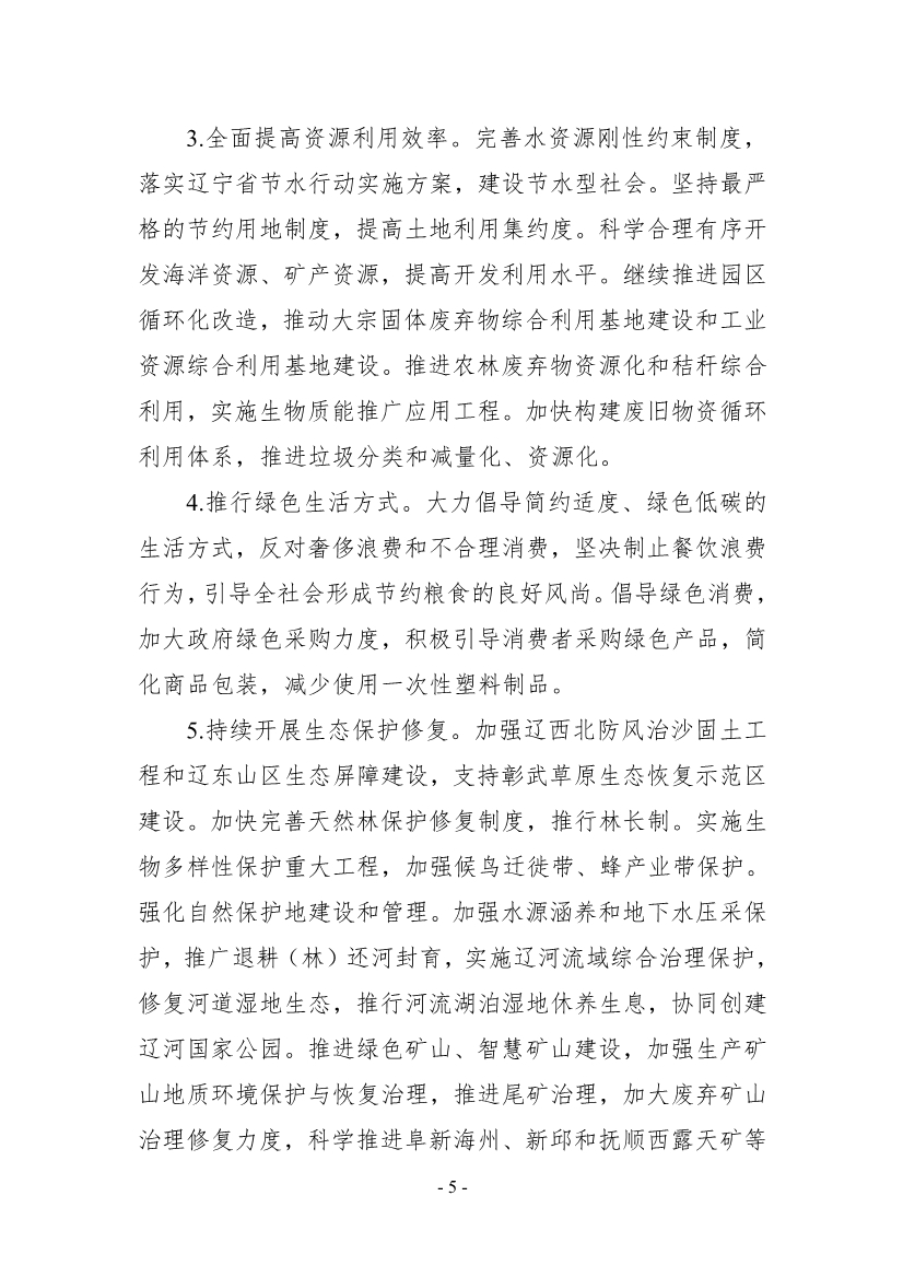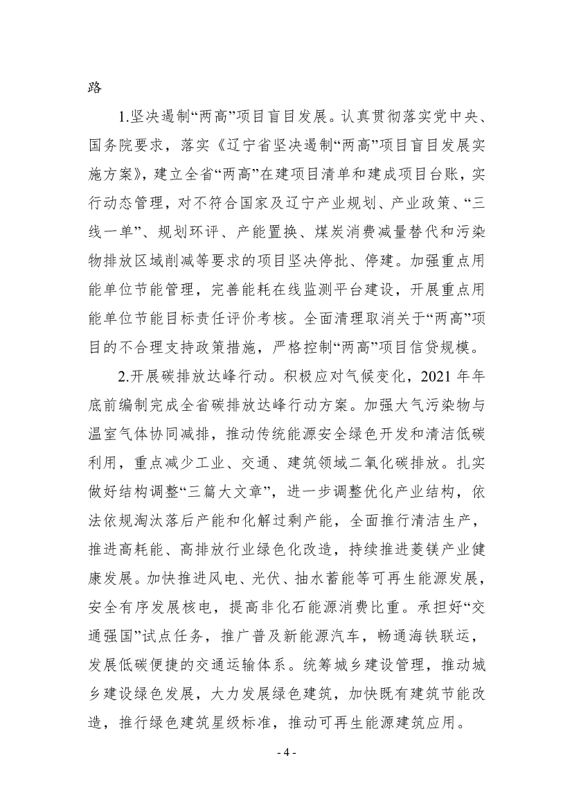 二是堅(jiān)定不移走生態(tài)優(yōu)先、綠色低碳的高質(zhì)量發(fā)展道路。堅(jiān)決遏制“兩高”項(xiàng)目盲目發(fā)展,認(rèn)真貫徹落實(shí)黨中央、國(guó)務(wù)院要求,對(duì)不符合要求的項(xiàng)目堅(jiān)決停批、停建。開(kāi)展碳排放達(dá)峰行動(dòng),加強(qiáng)大氣污染物與溫室氣體協(xié)同減排,推動(dòng)傳統(tǒng)能源安全綠色開(kāi)發(fā)和清潔低碳利用,重點(diǎn)減少工業(yè)、交通、建筑領(lǐng)域二氧化碳排放。扎實(shí)做好結(jié)構(gòu)調(diào)整“三篇大文章”,進(jìn)一步調(diào)整優(yōu)化產(chǎn)業(yè)結(jié)構(gòu),推進(jìn)高能耗、高排放行業(yè)綠色化改造。全面提高資源利用效率,建設(shè)節(jié)水型社會(huì),提高土地利用集約度,科學(xué)合理有序開(kāi)發(fā)海洋資源、礦產(chǎn)資源,推動(dòng)大宗固體廢棄物綜合利用基地建設(shè)和工業(yè)資源綜合利用基地建設(shè),推進(jìn)垃圾分類和減量化、資源化。推行綠色生活方式,大力倡導(dǎo)簡(jiǎn)約適度、綠色低碳的生活方式,倡導(dǎo)綠色消費(fèi)。持續(xù)開(kāi)展生態(tài)保護(hù)修復(fù),加強(qiáng)遼西北防風(fēng)治沙固土工程和遼東山區(qū)生態(tài)屏障建設(shè),加快完善天然林保護(hù)修復(fù)制度,實(shí)施生物多樣性保護(hù)重大工程,強(qiáng)化自然保護(hù)地建設(shè)和管理,實(shí)施遼河流域綜合治理保護(hù),協(xié)同創(chuàng)建遼河國(guó)家公園。