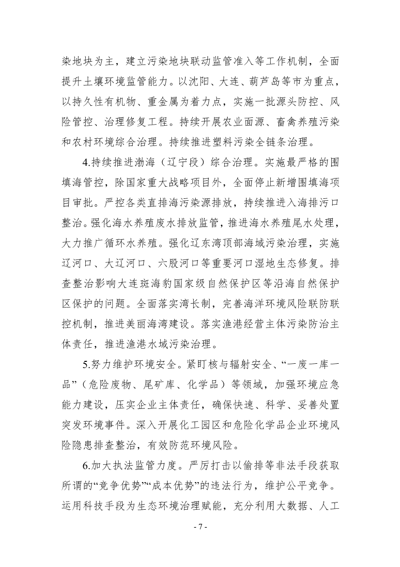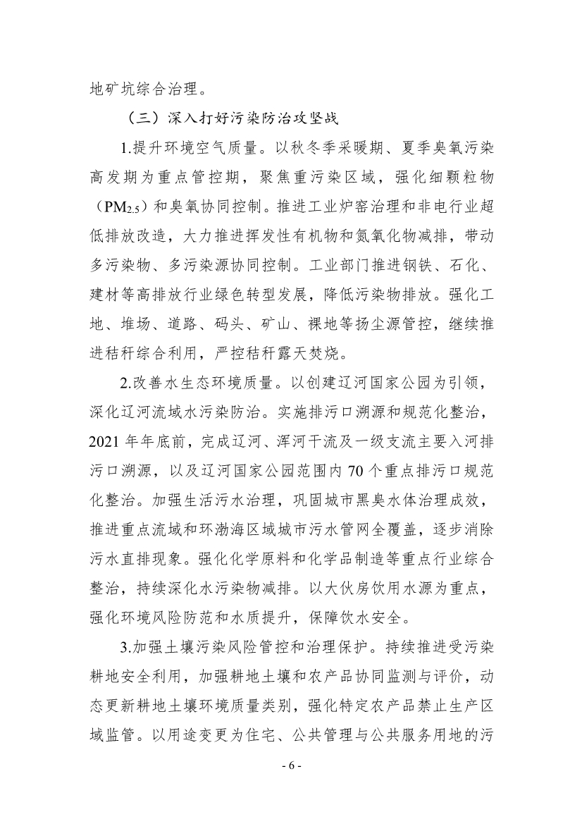 三是深入打好污染防治攻堅(jiān)戰(zhàn)。提升環(huán)境空氣質(zhì)量,強(qiáng)化細(xì)顆粒物(PM2.5)和臭氧協(xié)同控制,推進(jìn)揮發(fā)性有機(jī)物和氮氧化物減排,推進(jìn)鋼鐵、石化、建材等高排放行業(yè)綠色轉(zhuǎn)型發(fā)展。改善水生態(tài)環(huán)境質(zhì)量,實(shí)施排污口溯源和規(guī)范化整治,鞏固城市黑臭水體治理成效,推進(jìn)重點(diǎn)流域和環(huán)渤海區(qū)域城市污水管網(wǎng)全覆蓋,逐步消除污水直排現(xiàn)象。以大伙房飲用水源為重點(diǎn),強(qiáng)化環(huán)境風(fēng)險(xiǎn)防范和水質(zhì)提升,保障飲水安全。加強(qiáng)土壤污染風(fēng)險(xiǎn)管控和治理保護(hù),建立污染地塊聯(lián)動(dòng)監(jiān)管準(zhǔn)入等工作機(jī)制,實(shí)施一批源頭防控、風(fēng)險(xiǎn)管控、治理修復(fù)工程。持續(xù)推進(jìn)塑料污染全鏈條治理。持續(xù)推進(jìn)渤海(遼寧段)綜合治理,持續(xù)推進(jìn)入海排污口整治,推進(jìn)海水養(yǎng)殖尾水處理,實(shí)施遼河口、大遼河口、六股河口等重要河口濕地生態(tài)修復(fù),推進(jìn)漁港水域污染治理。努力維護(hù)環(huán)境安全,加強(qiáng)環(huán)境應(yīng)急能力建設(shè),深入開(kāi)展化工園區(qū)和危險(xiǎn)化學(xué)品企業(yè)環(huán)境風(fēng)險(xiǎn)隱患排查整治,有效防范環(huán)境風(fēng)險(xiǎn)。加大執(zhí)法監(jiān)管力度,嚴(yán)厲打擊以偷排等非法手段獲取所謂的“競(jìng)爭(zhēng)優(yōu)勢(shì)”“成本優(yōu)勢(shì)”的違法行為。補(bǔ)齊環(huán)境基礎(chǔ)設(shè)施短板,完善生活垃圾分類收集和分類運(yùn)輸體系,加快垃圾焚燒項(xiàng)目建設(shè),加快城市污水管網(wǎng)建設(shè),補(bǔ)足污水處理能力,加快污水處理廠污泥、生活垃圾場(chǎng)滲濾液處置設(shè)施建設(shè),推動(dòng)污泥、滲濾液減量化、資源化利用。