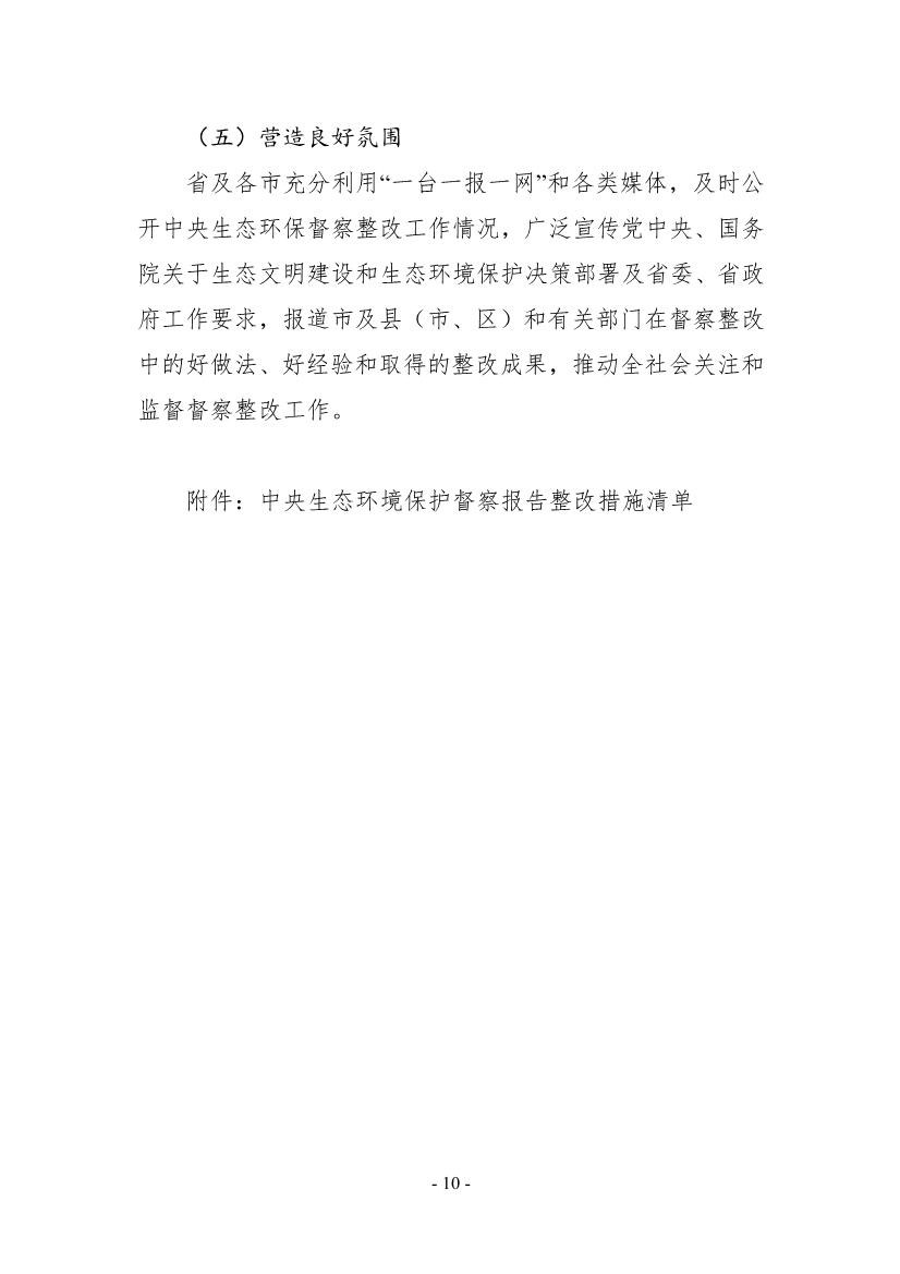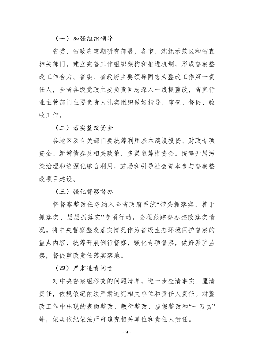 《整改方案》明確了5個(gè)方面保障措施。一是加強(qiáng)組織領(lǐng)導(dǎo),建立完善工作組織架構(gòu)和推進(jìn)機(jī)制,形成督察整改工作合力。二是落實(shí)整改資金,統(tǒng)籌利用基本建設(shè)投資、財(cái)政專項(xiàng)資金、新增債券及相關(guān)政策,鼓勵(lì)和引導(dǎo)社會(huì)資本參與督察整改項(xiàng)目建設(shè)。三是強(qiáng)化督察督辦,將整改落實(shí)情況作為省級(jí)生態(tài)環(huán)境保護(hù)督察重點(diǎn)內(nèi)容,督促整改責(zé)任落實(shí)落地。四是嚴(yán)肅追責(zé)問(wèn)責(zé),對(duì)整改工作中出現(xiàn)的表面整改、敷衍整改、虛假整改和“一刀切”等問(wèn)題,依規(guī)依紀(jì)依法嚴(yán)肅追究相關(guān)單位和責(zé)任人責(zé)任。五是營(yíng)造良好氛圍,充分利用“一臺(tái)一報(bào)一網(wǎng)”和各類媒體,及時(shí)公開(kāi)中央生態(tài)環(huán)保督察整改工作情況。
