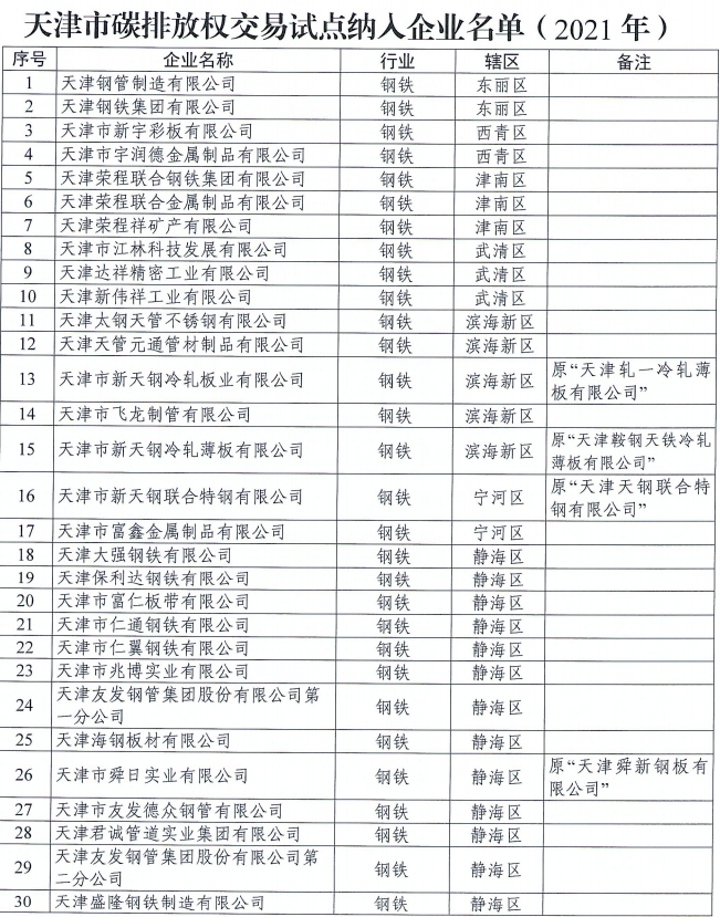 獲悉,12月20日,天津市生態(tài)環(huán)境局公開關于發(fā)布天津市碳排放權交易試點納入企業(yè)名單的通知,共160家企業(yè),詳情如下: