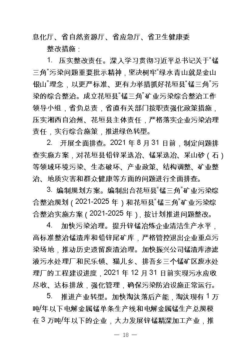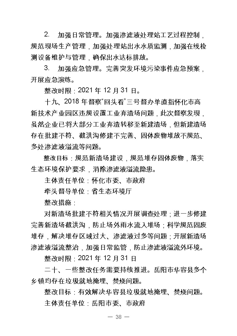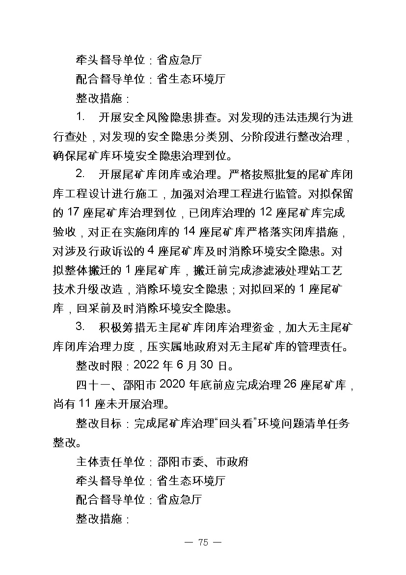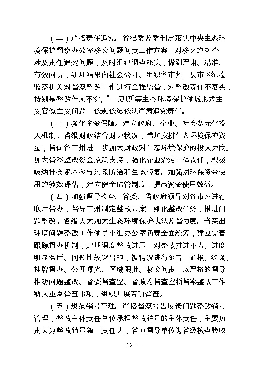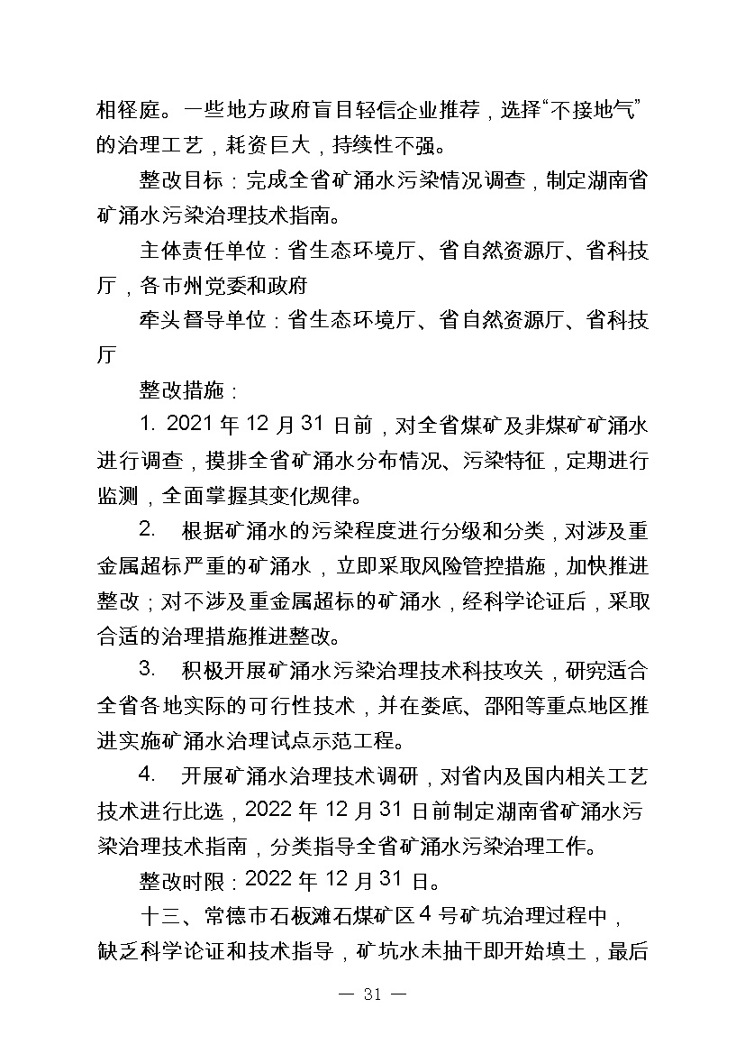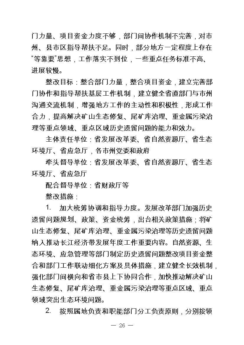 一是強(qiáng)化組織領(lǐng)導(dǎo)。各市州和省直有關(guān)部門進(jìn)一步健全整改工作組織領(lǐng)導(dǎo)體系,建立高效工作機(jī)制。各整改責(zé)任單位制定具體整改方案,報(bào)省突出環(huán)境問(wèn)題整改工作領(lǐng)導(dǎo)小組辦公室備案,作為督導(dǎo)調(diào)度和整改銷號(hào)依據(jù)。