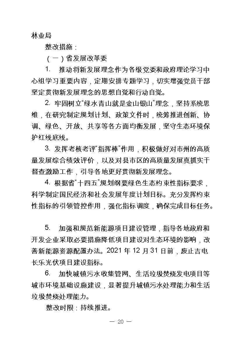 《整改方案》明確了四個(gè)方面整改工作目標(biāo):一是綠色發(fā)展理念進(jìn)一步深化。生態(tài)優(yōu)先、綠色發(fā)展理念進(jìn)一步增強(qiáng),碳達(dá)峰碳中和納入經(jīng)濟(jì)社會(huì)發(fā)展和生態(tài)文明建設(shè)總體布局,產(chǎn)業(yè)結(jié)構(gòu)、能源結(jié)構(gòu)、交通運(yùn)輸結(jié)構(gòu)、用地結(jié)構(gòu)進(jìn)一步優(yōu)化。二是督察反饋問(wèn)題整改到位。扎實(shí)推進(jìn)督察報(bào)告反饋問(wèn)題整改,確保問(wèn)題按照整改時(shí)限要求逐一整改到位。三是生態(tài)環(huán)境質(zhì)量持續(xù)改善。到2021年底,國(guó)考斷面地表水水質(zhì)達(dá)到國(guó)家考核要求,地級(jí)及以上城市細(xì)顆粒物(PM2.5)平均濃度控制在39微克/立方米以內(nèi),受污染地塊安全利用率達(dá)到91%以上。四是生態(tài)環(huán)境保護(hù)機(jī)制更加健全。抓緊改革創(chuàng)新和建章立制,完善生態(tài)環(huán)境保護(hù)法規(guī)、政策、標(biāo)準(zhǔn)體系,加快推進(jìn)生態(tài)環(huán)境治理體系和治理能力現(xiàn)代化。