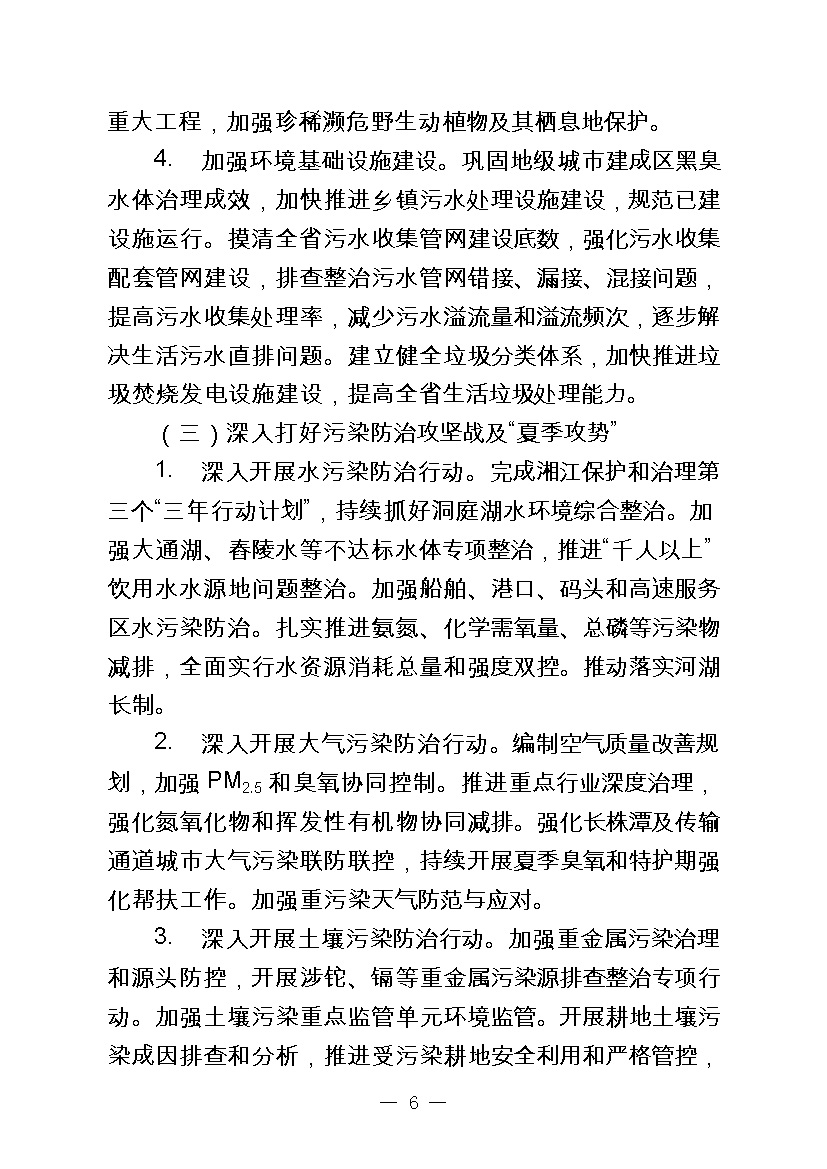 三是深入打好污染防治攻堅(jiān)戰(zhàn)及“夏季攻勢(shì)”。深入開(kāi)展水污染防治行動(dòng),完成湘江保護(hù)和治理第三個(gè)“三年行動(dòng)計(jì)劃”,持續(xù)抓好洞庭湖水環(huán)境綜合整治。深入開(kāi)展大氣污染防治行動(dòng),編制空氣質(zhì)量改善規(guī)劃,加強(qiáng)PM2.5和臭氧協(xié)同控制,強(qiáng)化長(zhǎng)株潭及傳輸通道城市大氣污染聯(lián)防聯(lián)控,加強(qiáng)重污染天氣防范與應(yīng)對(duì)。深入開(kāi)展土壤污染防治行動(dòng),加強(qiáng)重金屬污染治理和源頭防控,開(kāi)展涉鉈、鎘等重金屬污染源排查整治專項(xiàng)行動(dòng)。開(kāi)展地下水污染防治試點(diǎn)。繼續(xù)推進(jìn)“無(wú)廢城市”建設(shè)。加強(qiáng)農(nóng)業(yè)農(nóng)村面源污染治理,深入開(kāi)展化肥農(nóng)藥減施增效行動(dòng),加強(qiáng)畜禽水產(chǎn)養(yǎng)殖污染治理,深入開(kāi)展農(nóng)村環(huán)境整治。持續(xù)發(fā)起污染防治攻堅(jiān)戰(zhàn)“夏季攻勢(shì)”,繼續(xù)篩選一批群眾反映強(qiáng)烈、對(duì)環(huán)境質(zhì)量影響較大的環(huán)境問(wèn)題,采取項(xiàng)目化、工程化、清單化形式推進(jìn)污染防治攻堅(jiān)。