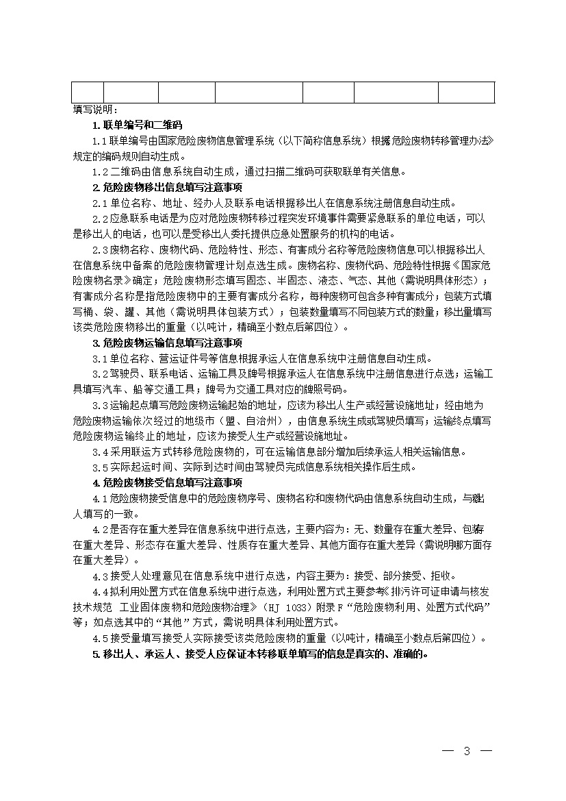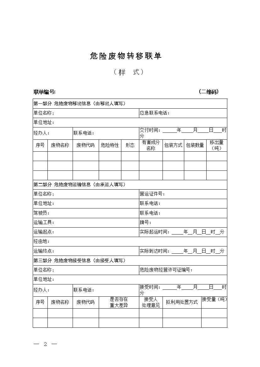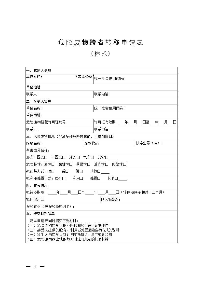 為貫徹落實《中華人民共和國固體廢物污染環(huán)境防治法》,根據(jù)《危險廢物轉(zhuǎn)移管理辦法》(生態(tài)環(huán)境部令第23號),我部制定了危險廢物轉(zhuǎn)移聯(lián)單和危險廢物跨省轉(zhuǎn)移申請表的樣式,現(xiàn)印發(fā)給你們,請結(jié)合本地區(qū)實際貫徹執(zhí)行。