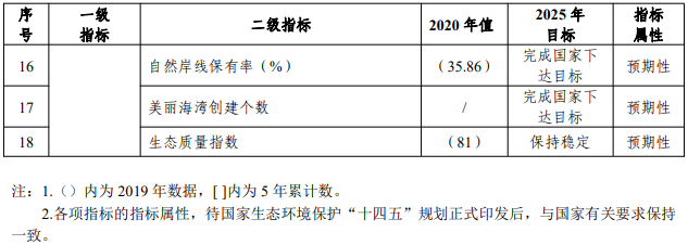 ——生態(tài)環(huán)境持續(xù)改善。大氣環(huán)境質(zhì)量繼續(xù)領(lǐng)跑先行,PM2.5 濃度保持穩(wěn)定,臭氧濃度力爭(zhēng)進(jìn)入下降通道;水環(huán)境質(zhì)量持續(xù)提升, 水生態(tài)功能初步得到恢復(fù),國(guó)考斷面劣Ⅴ類(lèi)水體和縣級(jí)以上城市建 成區(qū)黑臭水體全面消除,近岸海域水質(zhì)總體優(yōu)良。
