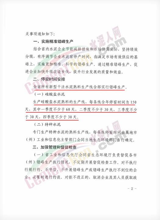 生產(chǎn)硅酸鹽水泥熟料的生產(chǎn)線,每條線全年停窯時間為150 天,其中一季度不少于60天,二季度不少于30天,三季度不少于30天,四季度不少于30天。專門生產(chǎn)特種水泥的熟料生產(chǎn)線,每條線停窯時間由屬地市(州)工業(yè)和信息化主管部門會同當?shù)厣鷳B(tài)環(huán)境部門自行確定。