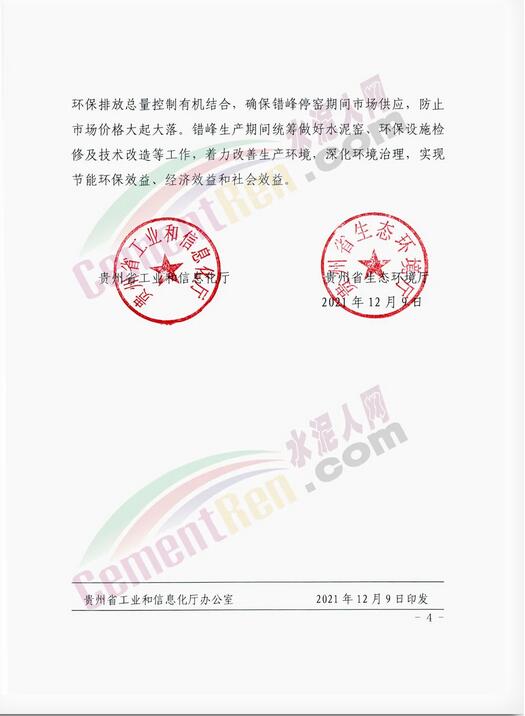 《貴州省關于做好2022年度水泥行業(yè)錯峰生產(chǎn)的通知》(黔工信原材料【2021】109號)