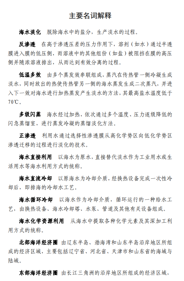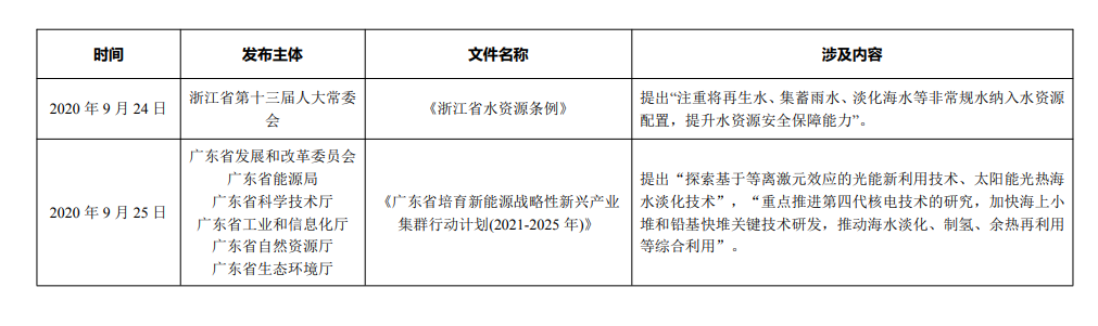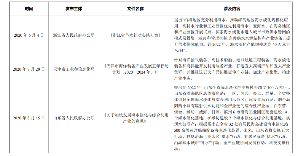 山東省人民政府辦公廳出臺《關(guān)于加快發(fā)展海水淡化與綜合利用產(chǎn)業(yè)的意見》,提出到 2022 年山東全省海水淡化產(chǎn)能規(guī)模將超過 100 萬噸/日,并形成一區(qū)、兩園、多點(diǎn)、群星的總體布局。 江蘇省人民政府出臺《江蘇省人民政府關(guān)于推進(jìn)綠色產(chǎn)業(yè)發(fā)展的意見》,提出對實(shí)行兩部制電價(jià)的污水處理企業(yè)用 電、電動汽車集中式充換電設(shè)施用電、港口岸電運(yùn)營商用電、 海水淡化用電,免收需量(容量)電費(fèi)。 大連、天津、浙江、廣東、海南等沿海省市將海水淡化納入海洋中心城市建設(shè)、海洋裝備、水資源管理、戰(zhàn)略性新 興產(chǎn)業(yè)集群等行動計(jì)劃、指導(dǎo)意見或?qū)嵤┓桨钢小?nbsp;