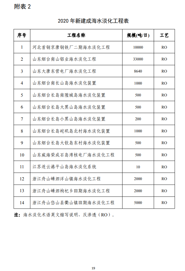 海水淡化水的主要用途以工業(yè)用水和生活用水為主。其 中,海水淡化用于工業(yè)用水主要集中在沿海地區(qū)北部、東部和南部海洋經(jīng)濟(jì)圈的電力、石化、鋼鐵等高耗水行業(yè);海水淡化用于生活用水主要集中在海島地區(qū)和北部海洋經(jīng)濟(jì)圈的天津、青島 2 個(gè)沿海城市。2020 年,新增海水淡化工程用于工業(yè)用水主要是為首鋼京唐鋼鐵廠、煙臺南山鋁業(yè)、大唐 東營電廠等高耗水企業(yè)提供高品質(zhì)工業(yè)用水;新增海水淡化工程用于生活用水主要是為舟山和煙臺缺水海島提供可靠 的水資源供給。