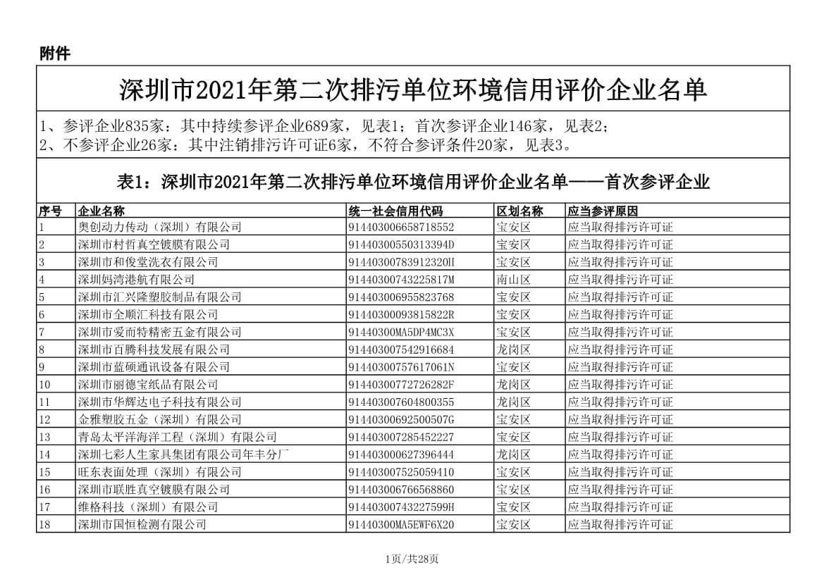 獲悉,11月26日,深圳市生態(tài)環(huán)境局發(fā)布了關(guān)于公布深圳市2021年第二次排污單位環(huán)境信用評(píng)價(jià)企業(yè)名單的通知。包括參評(píng)企業(yè)835家,其中持續(xù)參評(píng)企業(yè)689家,首次參評(píng)企業(yè)146家;不參評(píng)企業(yè)26家,其中注銷排污許可證6家,不符合參評(píng)條件20家。全文如下: