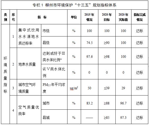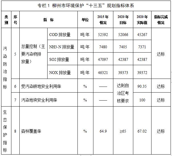 總之,通過不懈努力,柳州市生態(tài)環(huán)境保護“十三五”規(guī)劃提出的8項約束性指標(biāo)全部完成。