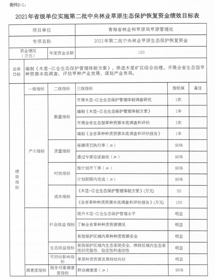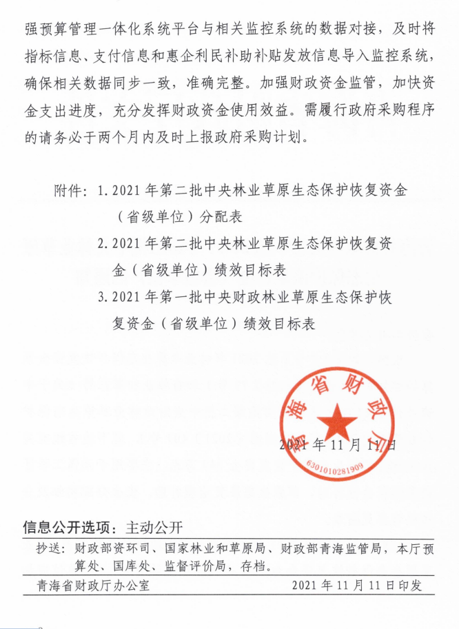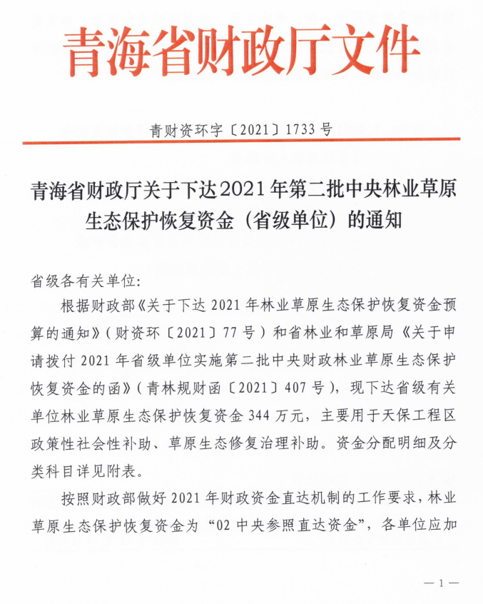 《青海省財(cái)政廳發(fā)布關(guān)于下達(dá)2021年第二批中央林業(yè)草原生態(tài)保護(hù)恢復(fù)資金(省級單位)的通知》(青財(cái)資環(huán)字【2021】1173號)