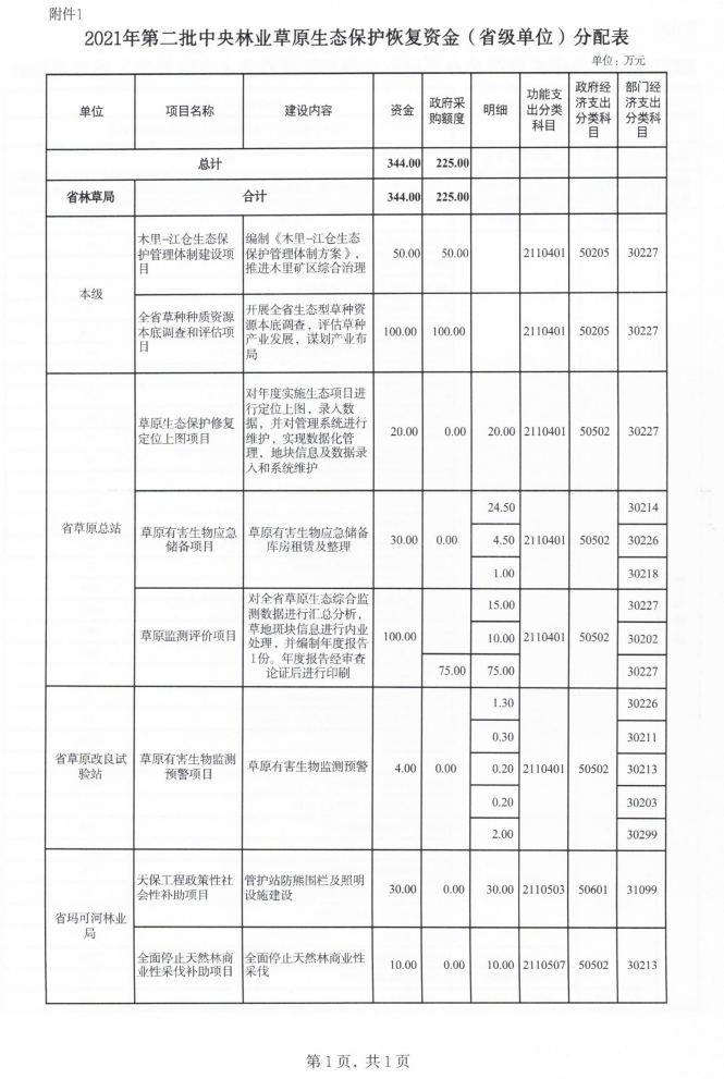 獲悉,11月24日,青海省財(cái)政廳發(fā)布關(guān)于下達(dá)2021年第二批中央林業(yè)草原生態(tài)保護(hù)恢復(fù)資金(省級單位)的通知,現(xiàn)下達(dá)省級有關(guān)單位林業(yè)草原生態(tài)保護(hù)恢復(fù)資金344萬元,主要用于天保工程區(qū)政策性社會性補(bǔ)助、草原生態(tài)修復(fù)治理補(bǔ)助。詳情如下: