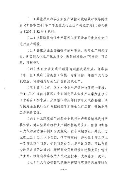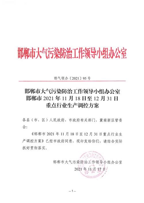 《邯鄲市2021年11月18日至12月31日重點行業(yè)生產(chǎn)調(diào)控方案》(邯氣領(lǐng)辦【2021】95號)