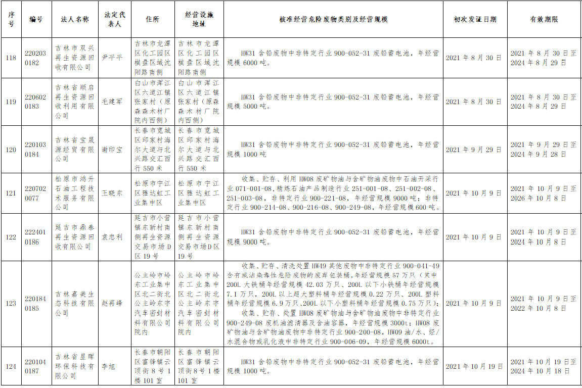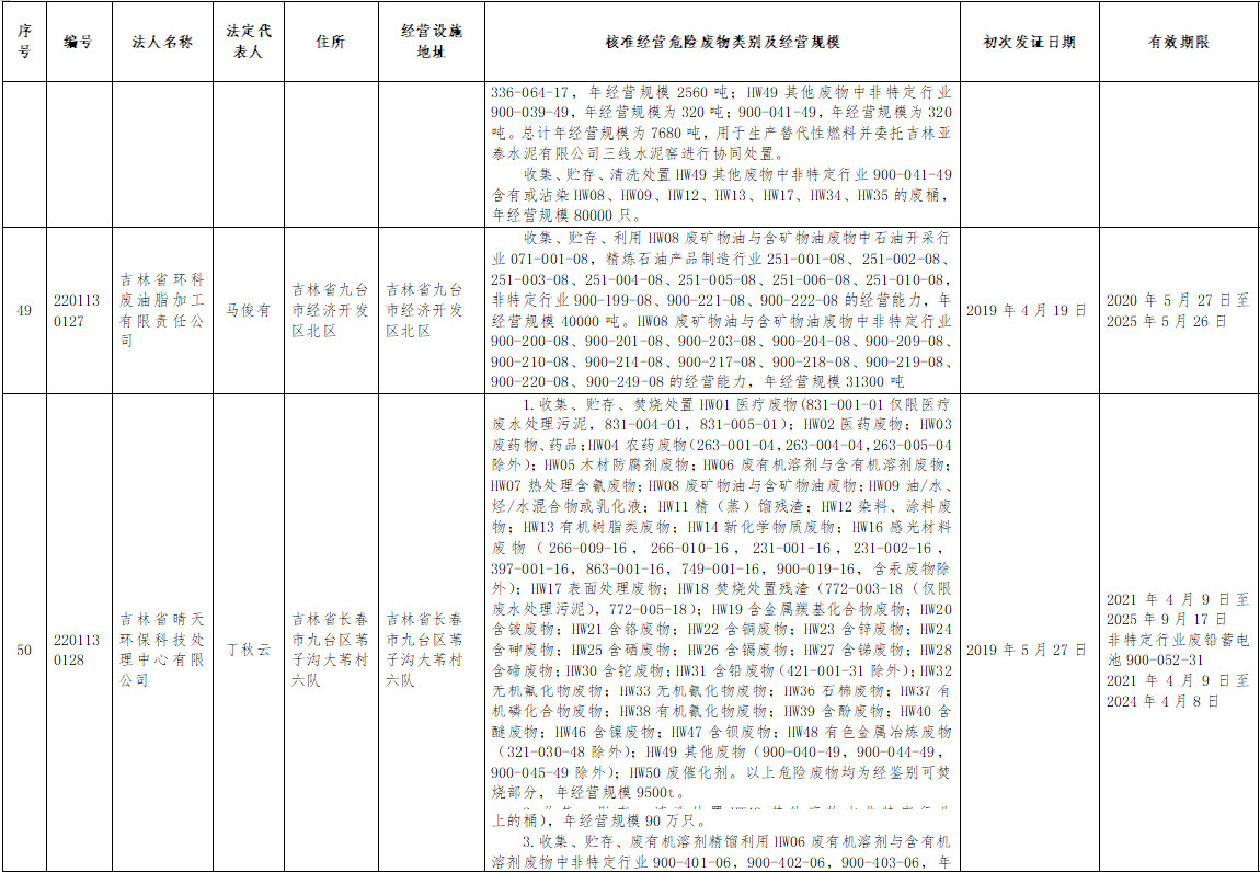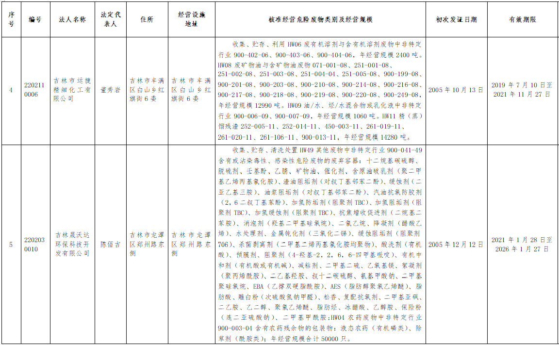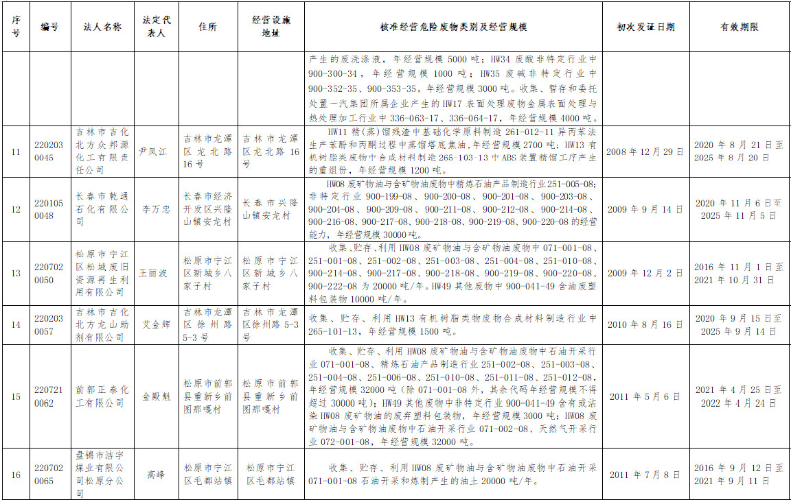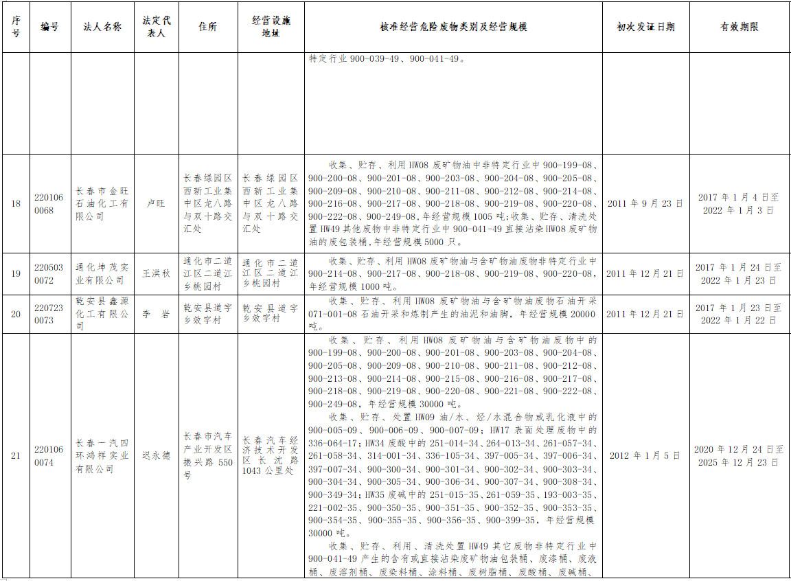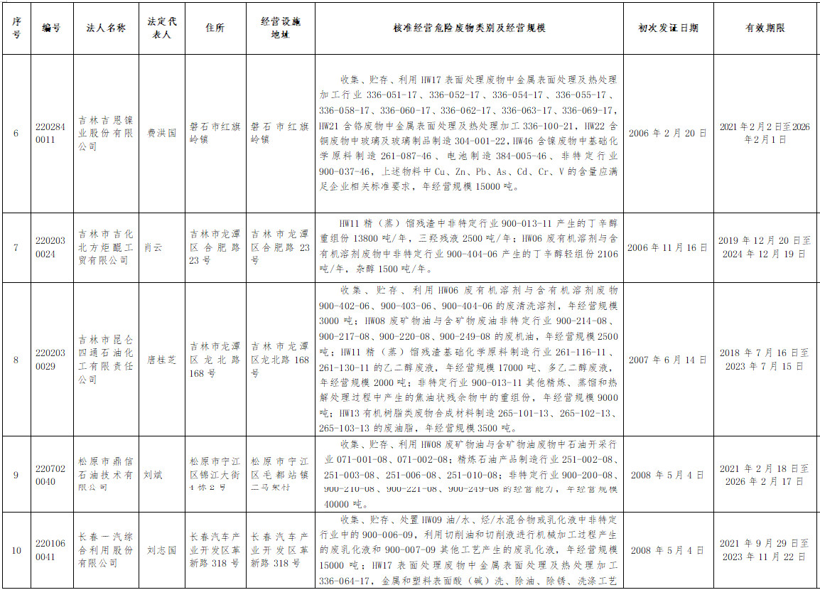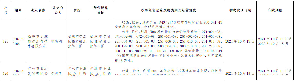 吉林省危險廢物經(jīng)營許可證持證企業(yè)名單(2021年10月更新)