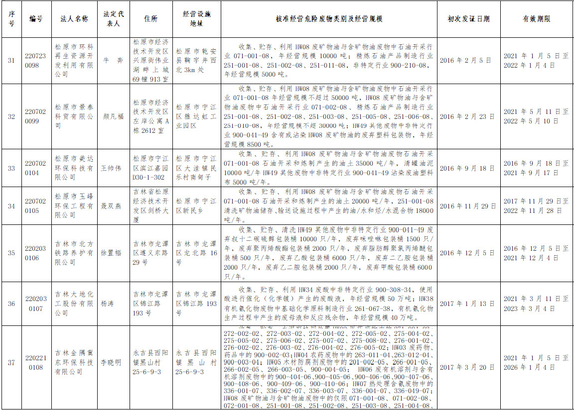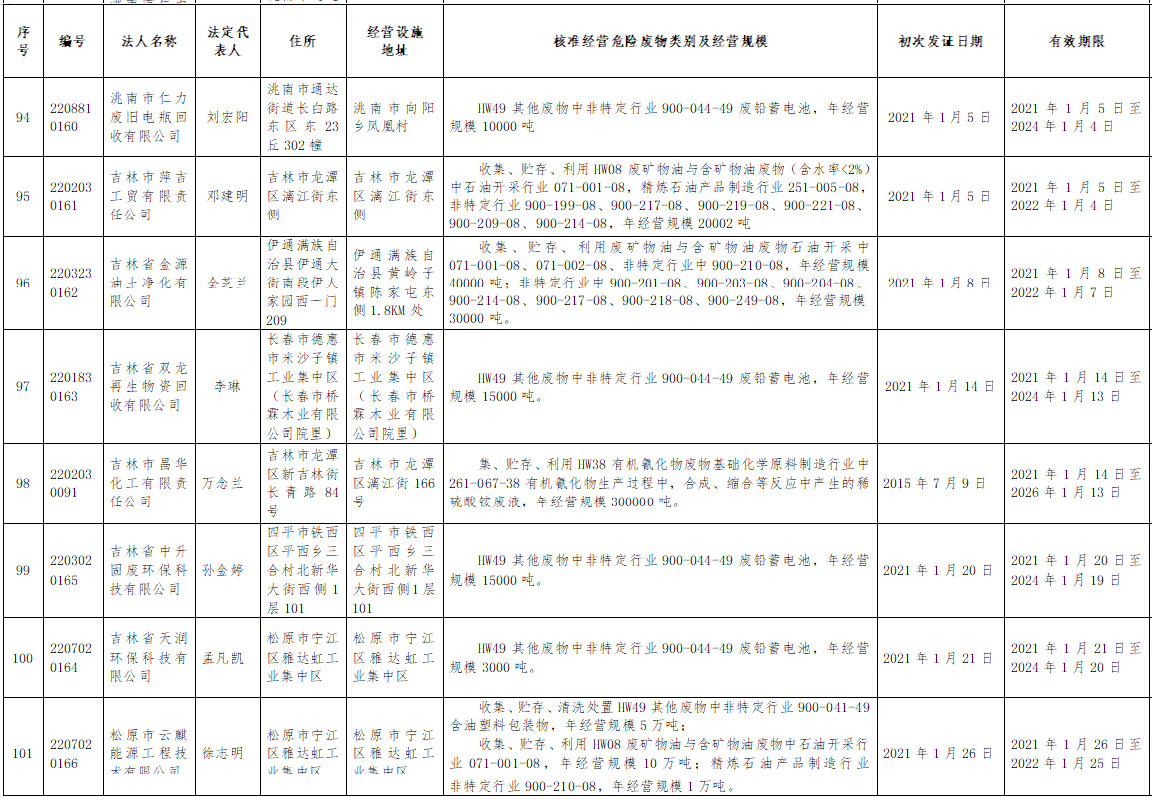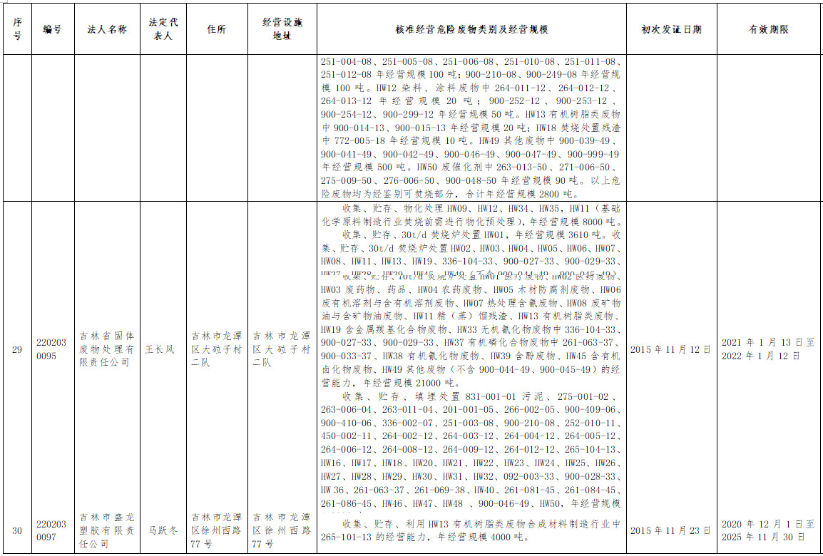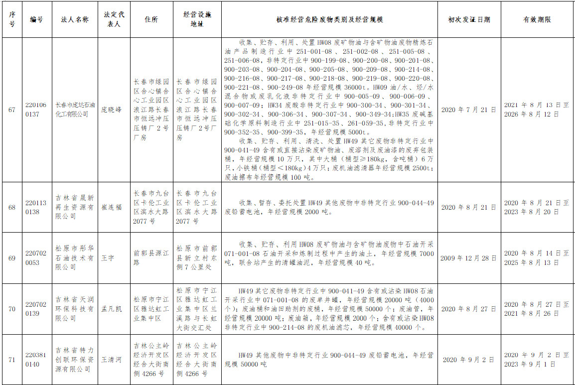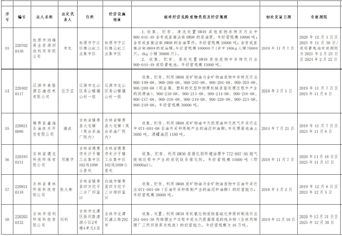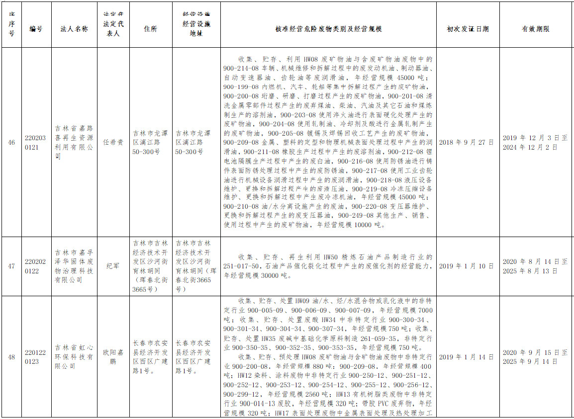 吉林省危險廢物經(jīng)營許可證持證企業(yè)名單(2021年10月更新)