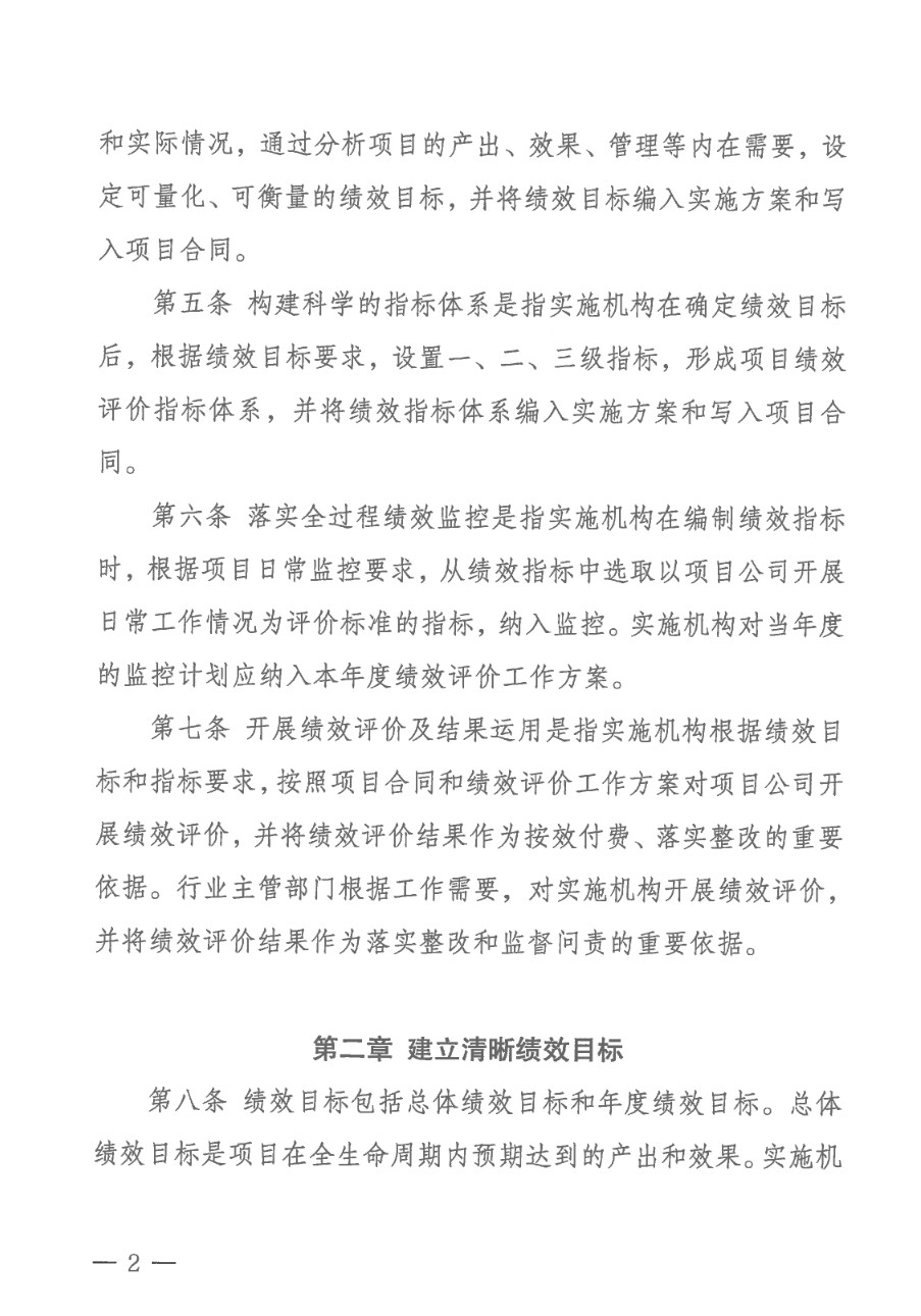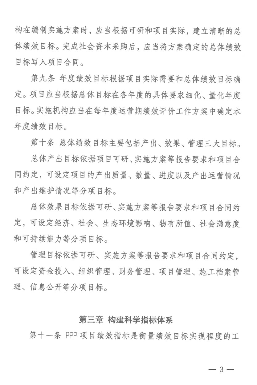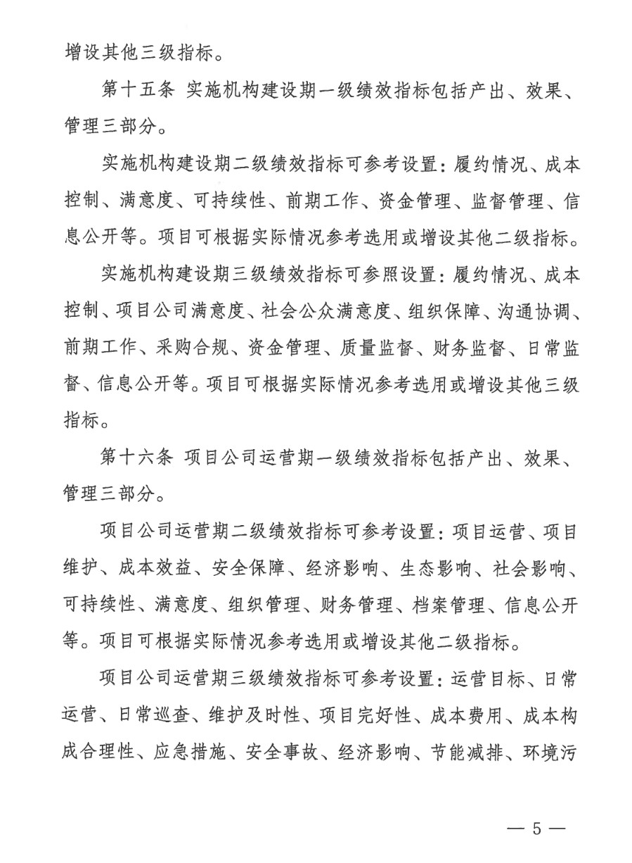 《實(shí)施細(xì)則》根據(jù)建設(shè)期或運(yùn)營(yíng)期的不同階段特點(diǎn)細(xì)化設(shè)置了三個(gè)級(jí)次的量化指標(biāo),針對(duì)不同評(píng)價(jià)對(duì)象分類設(shè)置評(píng)價(jià)指標(biāo)體系。例如針對(duì)項(xiàng)目公司,在PPP項(xiàng)目建設(shè)期設(shè)置竣工驗(yàn)收、可持續(xù)性、資金管理等指標(biāo),突出考察項(xiàng)目建設(shè)質(zhì)量和資金使用情況;在項(xiàng)目運(yùn)營(yíng)期設(shè)置項(xiàng)目運(yùn)營(yíng)成本等經(jīng)濟(jì)指標(biāo)、社會(huì)環(huán)境影響等效果指標(biāo),以及項(xiàng)目規(guī)范性等管理指標(biāo),多維度綜合評(píng)價(jià)項(xiàng)目的經(jīng)濟(jì)社會(huì)效益。PPP項(xiàng)目績(jī)效評(píng)價(jià)結(jié)果將作為按效付費(fèi)、落實(shí)整改、監(jiān)督問責(zé)的重要依據(jù)。