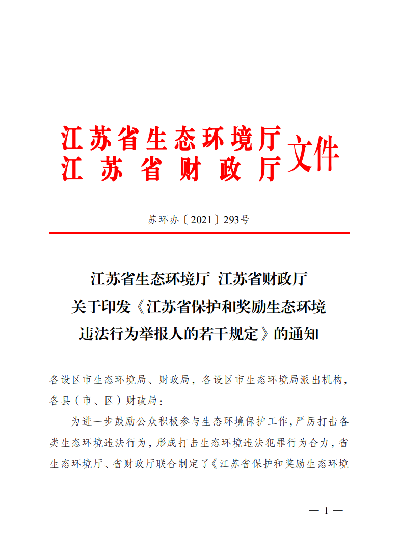 《江蘇省保護(hù)和獎(jiǎng)勵(lì)生態(tài)環(huán)境違法行為舉報(bào)人的若干規(guī)定》(蘇環(huán)辦【2021】293號(hào))