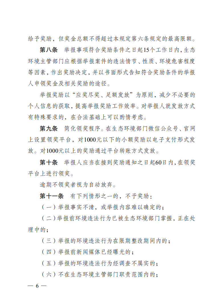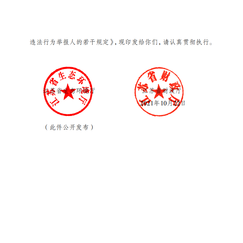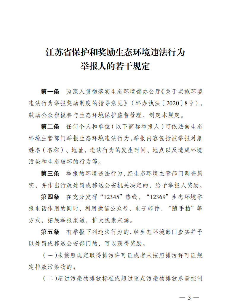 為進(jìn)一步鼓勵(lì)公眾積極參與生態(tài)環(huán)境保護(hù)工作,嚴(yán)厲打擊各類生態(tài)環(huán)境違法行為,形成打擊生態(tài)環(huán)境違法犯罪行為合力,近日,江蘇省生態(tài)環(huán)境廳、江蘇省財(cái)政廳聯(lián)合印發(fā)《江蘇省保護(hù)和獎(jiǎng)勵(lì)生態(tài)環(huán)境違法行為舉報(bào)人的若干規(guī)定》,進(jìn)一步規(guī)范生態(tài)環(huán)境違法行為舉報(bào)獎(jiǎng)勵(lì)制度。