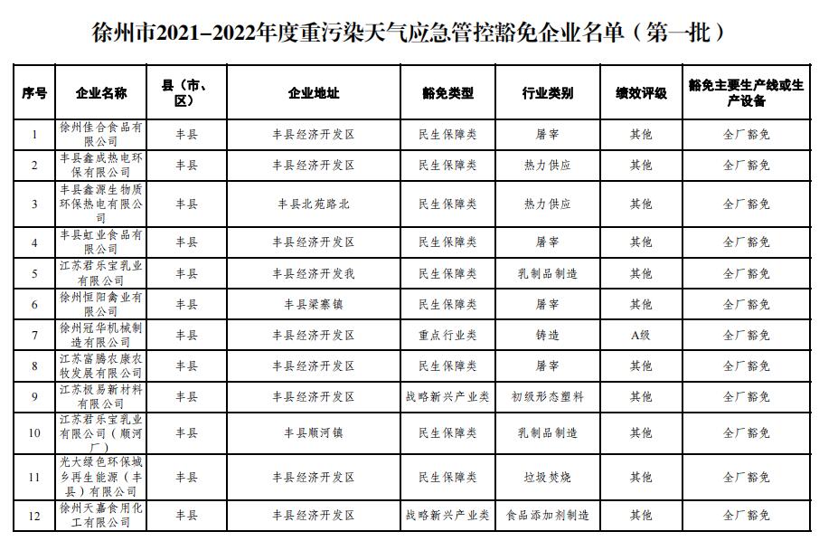 日前,徐州公布2021-2022年度重污染天氣應(yīng)急管控豁免企業(yè)、工地名單(第一批)。詳情如下: