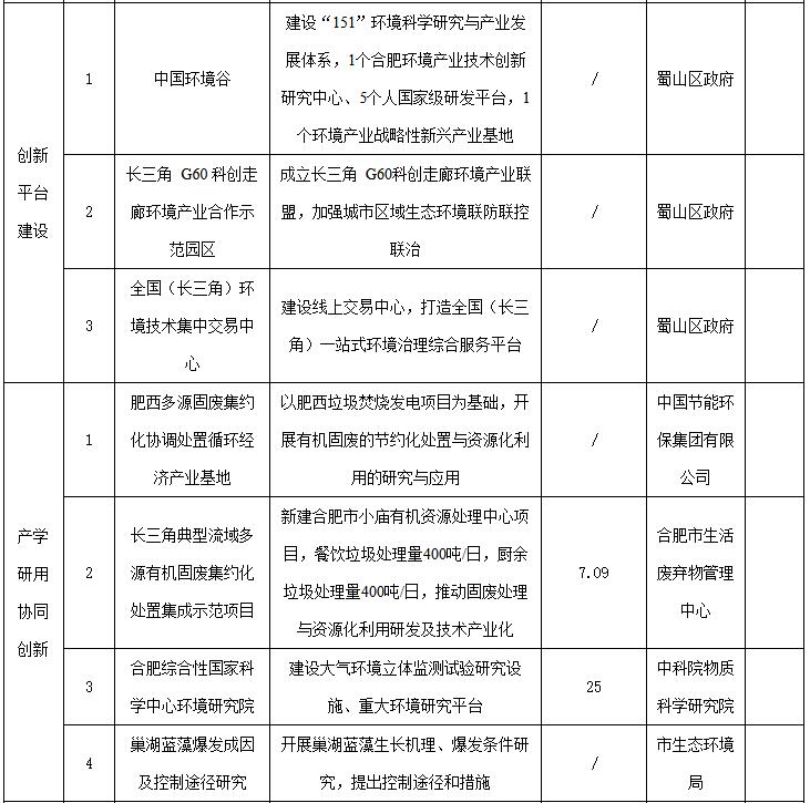 深化與中國節(jié)能環(huán)保集團有限公司的戰(zhàn)略合作,建設(shè)肥西多源固廢集約化協(xié)調(diào)處置循環(huán)經(jīng)濟產(chǎn)業(yè)基地,以肥西垃圾焚燒發(fā)電項目為基礎(chǔ),開展有機固廢的節(jié)約化處置與資源化利用;開展長三角典型流域多源有機固廢集約化處置集成示范項目,新建合肥市小廟有機資源處理中心項目,推動固廢處理與資源化利用研發(fā)及技術(shù)產(chǎn)業(yè)化;與中科院合肥物質(zhì)科學研究院等大院大所合作,促進環(huán)境領(lǐng)域相關(guān)科技成果的轉(zhuǎn)化、應用和推廣,推動組建合肥綜合性國家科學中心環(huán)境研究院,建設(shè)大氣環(huán)境立體監(jiān)測試驗研究設(shè)施,開展大氣環(huán)境立體監(jiān)測試驗研究等。