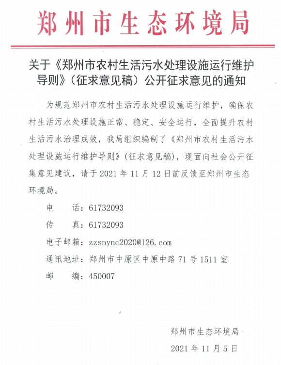 獲悉,鄭州市生態(tài)環(huán)境局為規(guī)范鄭州市農(nóng)村生活污水處理設(shè)施運(yùn)行維護(hù),確保農(nóng)村生活污水處理設(shè)施正常、穩(wěn)定、安全運(yùn)行,全面提升農(nóng)村生活污水治理成效,我局組織編制了《鄭州市農(nóng)村生活污水處理設(shè)施運(yùn)行維護(hù)導(dǎo)則》(征求意見稿),現(xiàn)面向社會(huì)公開征集意見建議,請(qǐng)于2021年11月12日前反饋至鄭州市生態(tài)環(huán)境局。
