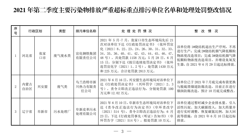 獲悉,日前,生態(tài)環(huán)境部發(fā)布關(guān)于2021年第二季度主要污染物排放嚴(yán)重超標(biāo)重點(diǎn)排污單位名單和處理處罰整改情況的函。
