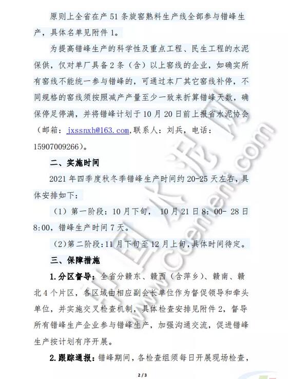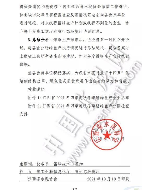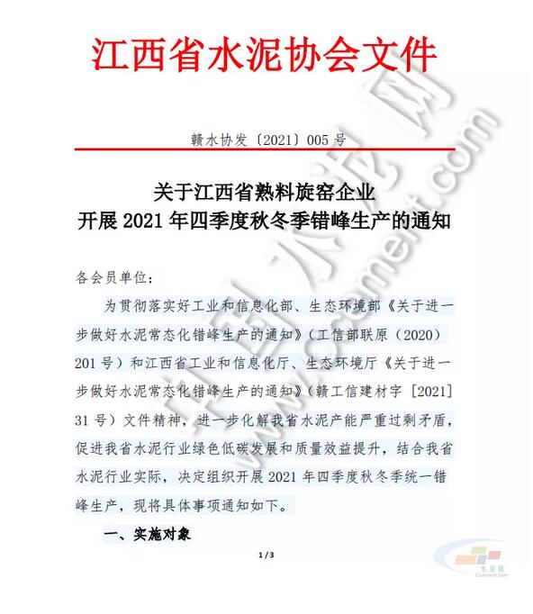 《關(guān)于江西省熟料旋窯企業(yè) 開展2021年四季度秋冬季錯峰生產(chǎn)的通知》(贛水協(xié)發(fā)【2021】005號)
