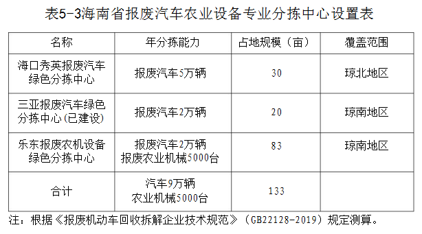 海口秀英區(qū)報(bào)廢汽車專業(yè)型分揀中心。每年全省報(bào)廢汽車產(chǎn)生量約5萬輛。??谛阌^(qū)報(bào)廢汽車專業(yè)型分揀中心承擔(dān)瓊北部地區(qū)報(bào)廢機(jī)動(dòng)車、農(nóng)業(yè)機(jī)械等機(jī)體的拆解、分揀、包裝、運(yùn)輸?shù)忍峁┚C合處理平臺(tái)。用地約30畝,拆解產(chǎn)能5萬輛/年,年拆解能力單位面積產(chǎn)能約5噸/平方米。??谛阌^(qū)報(bào)廢汽車專業(yè)型分揀中心可與海口市再生資源集散中心一體化規(guī)劃建設(shè)。